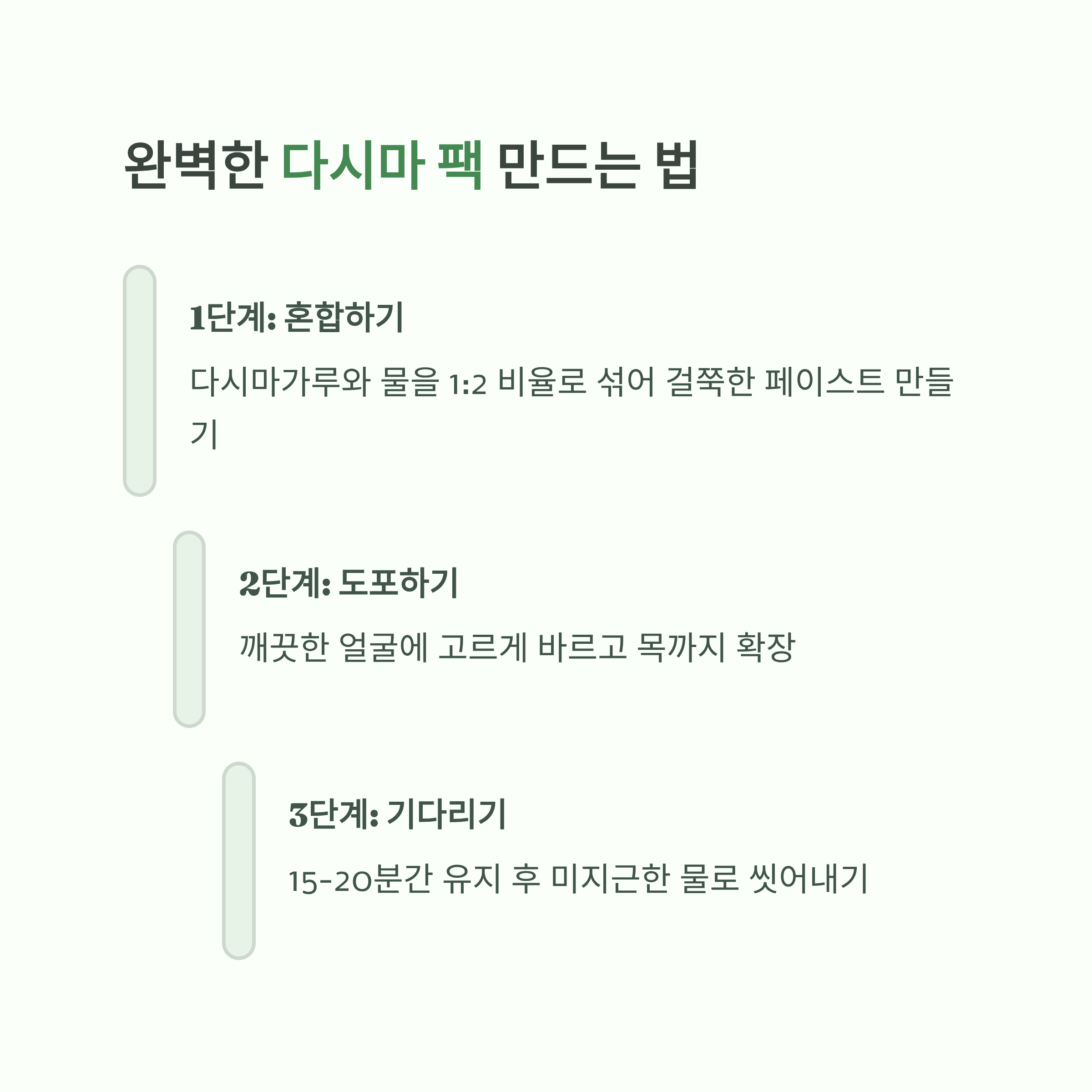 | 적정 시간 준수 | 15~20분 유지, 팩이 마르기 전 제거 | 피부 수분 유지, 부작용 방지 |