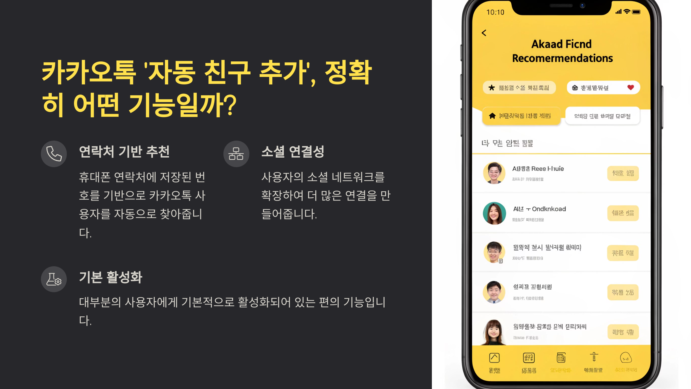 🤔 카카오톡(카톡)을 사용하다 보면, 내 휴대폰 주소록에 있는 사람이 자동으로 친구 목록에 뜨는 편리한 기능을 경험하게 됩니다. 바로 '자동 친구 추가' 기능인데요. 연락처만 저장하면 별도의 친구 추가 과정 없이 바로 카톡 대화를 시작할 수 있어 많은 분들이 유용하게 사용하고 계실 겁니다.