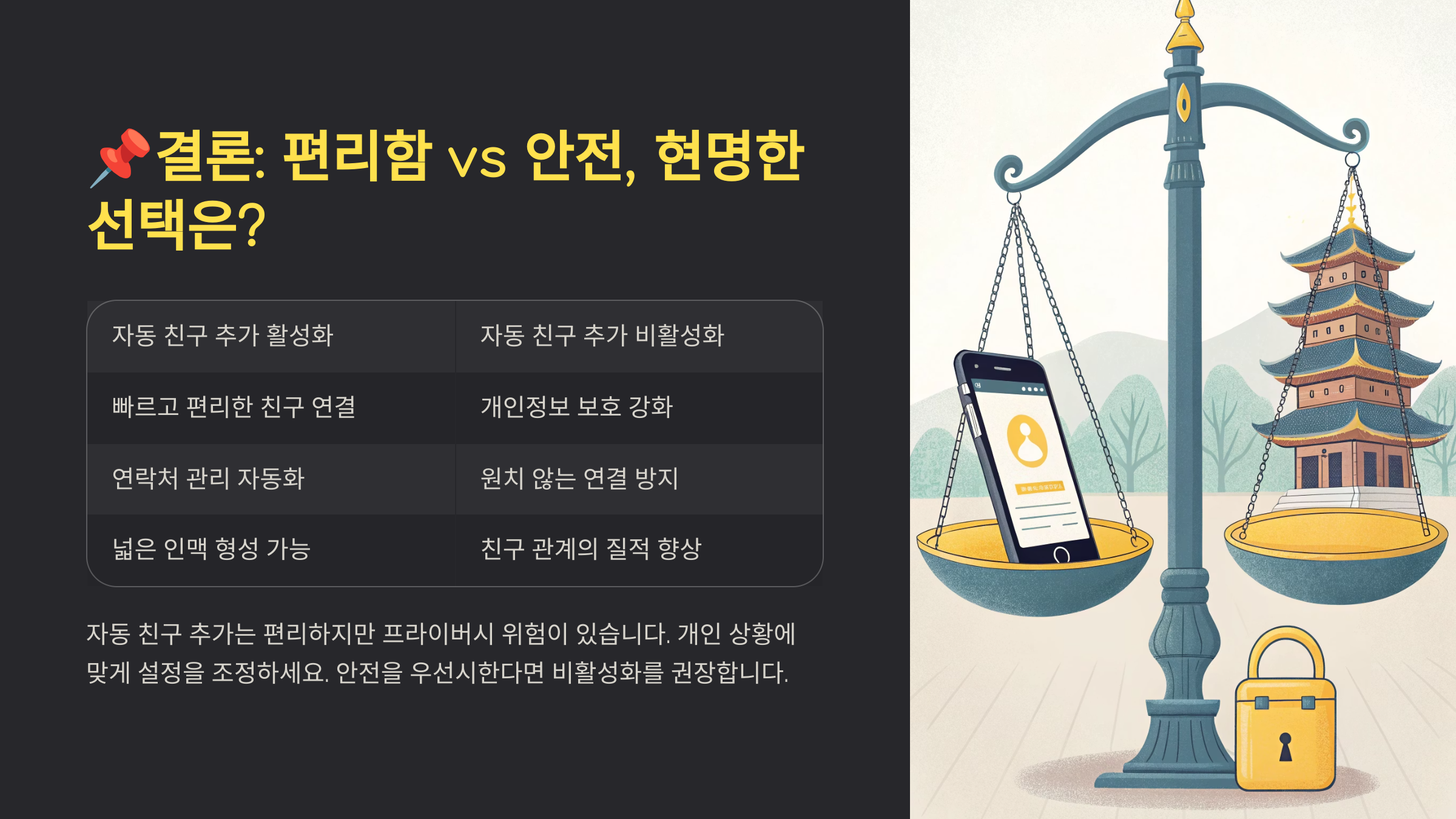 어떤 선택이 무조건 옳다고 말할 수는 없습니다. 연락처를 교환하는 모든 사람과 카톡 친구가 되는 것이 편하고 문제가 없다고 생각한다면 기존 설정을 유지할 수도 있습니다. 하지만 단 한 번이라도 원치 않는 친구 추가로 불편함을 겪었거나, 나의 사생활 노출 및 잠재적인 범죄 악용 가능성에 대해 우려가 된다면, 지금 바로 설정을 변경하는 것을 강력히 권장합니다.