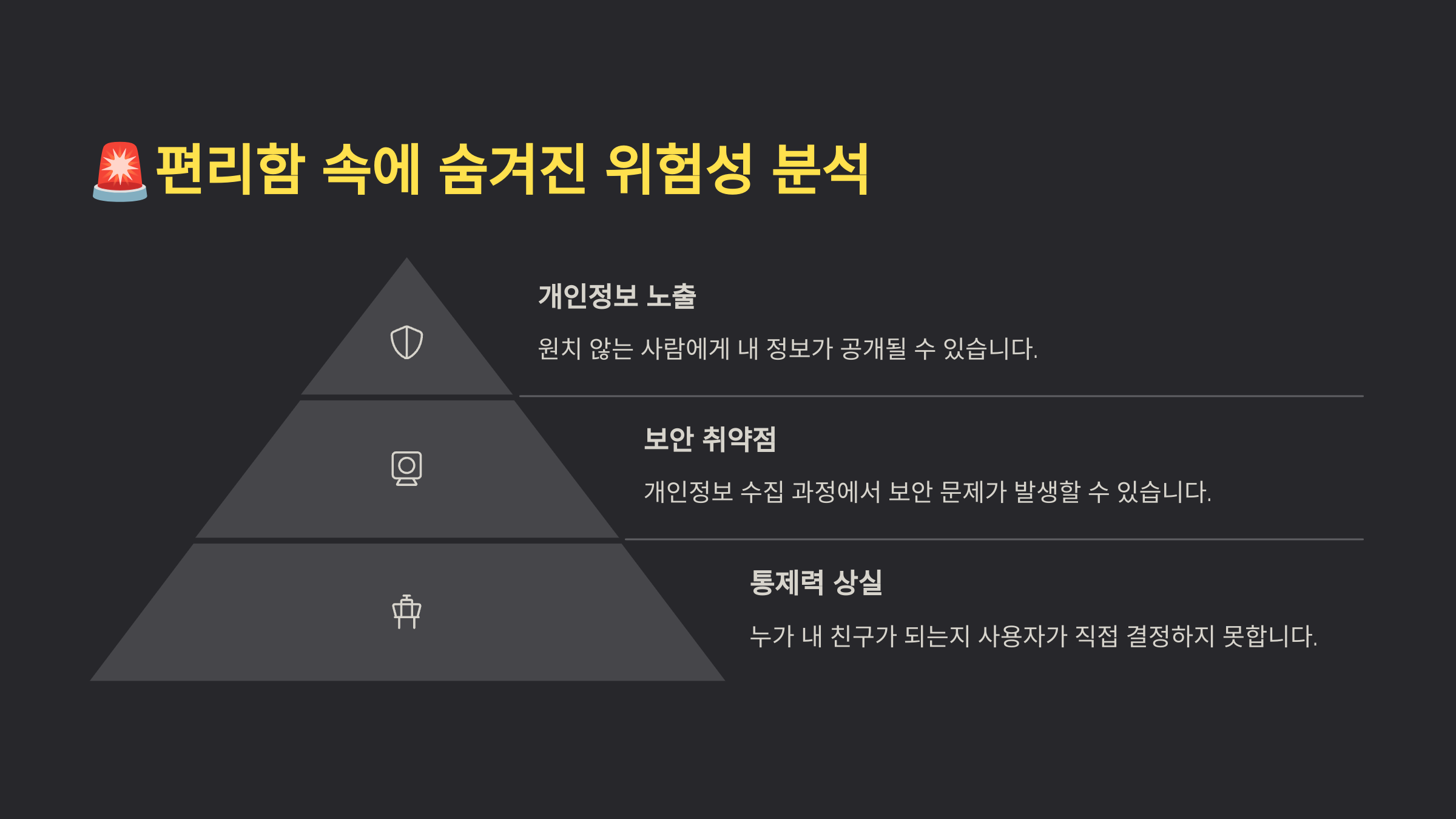 | 원치 않는 관계 노출 | 보고 싶지 않은 사람에게 내 프로필 자동 공개 |