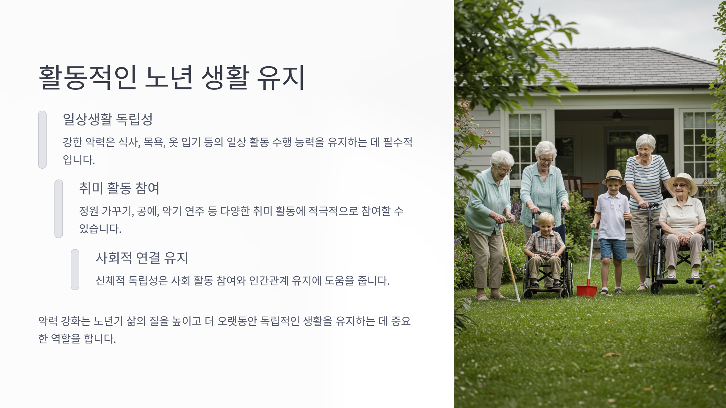 탄탄한 악력은 단순히 오래 사는 것뿐만 아니라, '건강하고 활동적으로' 오래 사는 것, 즉 성공적인 노화(Active Aging)에 필수적인 요소입니다. 일상생활에서 물건을 들고, 문을 열고 닫고, 병뚜껑을 따고, 요리를 하는 등 수많은 활동들이 손의 힘, 즉 악력을 필요로 합니다. 악력이 약해지면 이러한 기본적인 일상생활 수행 능력이 저하되어 독립적인 생활이 어려워지고 삶의 질이 떨어질 수 있습니다. 반대로, 충분한 악력을 유지하는 것은 노년기에도 활기차고 자립적인 생활을 영위하는 데 중요한 밑바탕이 됩니다.