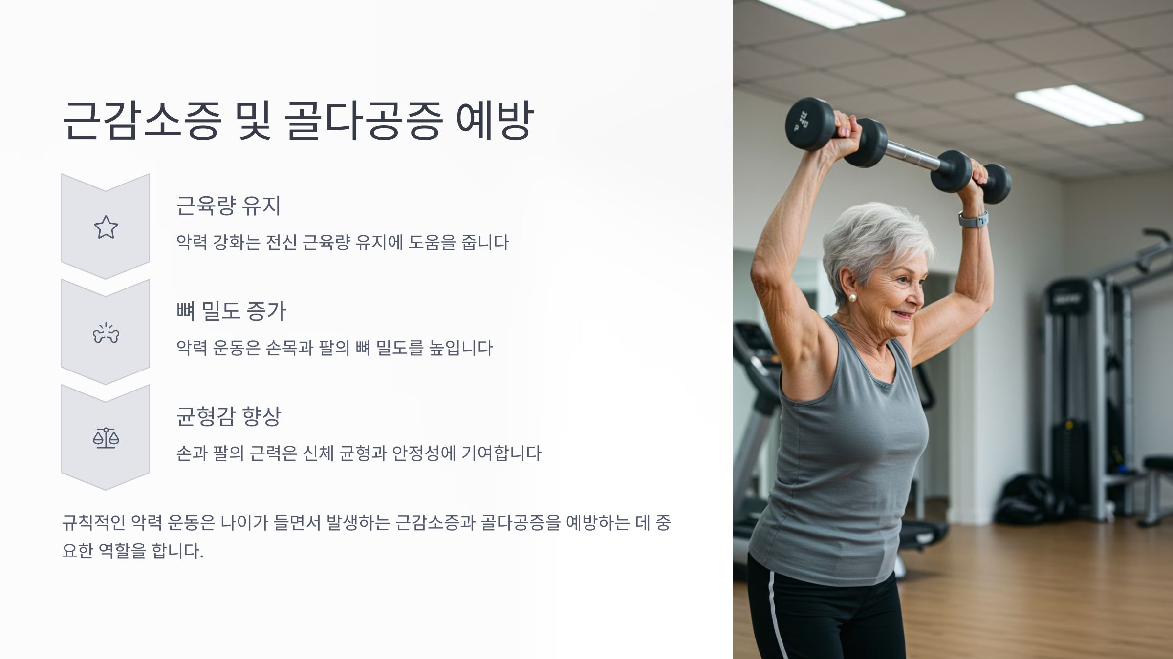 나이가 들면서 자연스럽게 근육량이 줄어드는 '근감소증(Sarcopenia)'은 노년기 건강을 위협하는 주요 요인 중 하나입니다. 근육은 우리 몸을 지탱하고 움직이게 하는 기본적인 역할을 할 뿐만 아니라, 신진대사, 면역 기능 등에도 관여합니다. 악력은 이러한 전신 근육량 및 근력과 높은 상관관계를 보입니다. 따라서 악력을 강화하는 운동은 손뿐만 아니라 전신 근육 발달을 촉진하여 근감소증 예방에 도움을 줄 수 있습니다. 또한, 근력 운동은 뼈에 적절한 자극을 주어 골밀도를 높이고 골다공증 위험을 낮추는 데도 기여합니다.