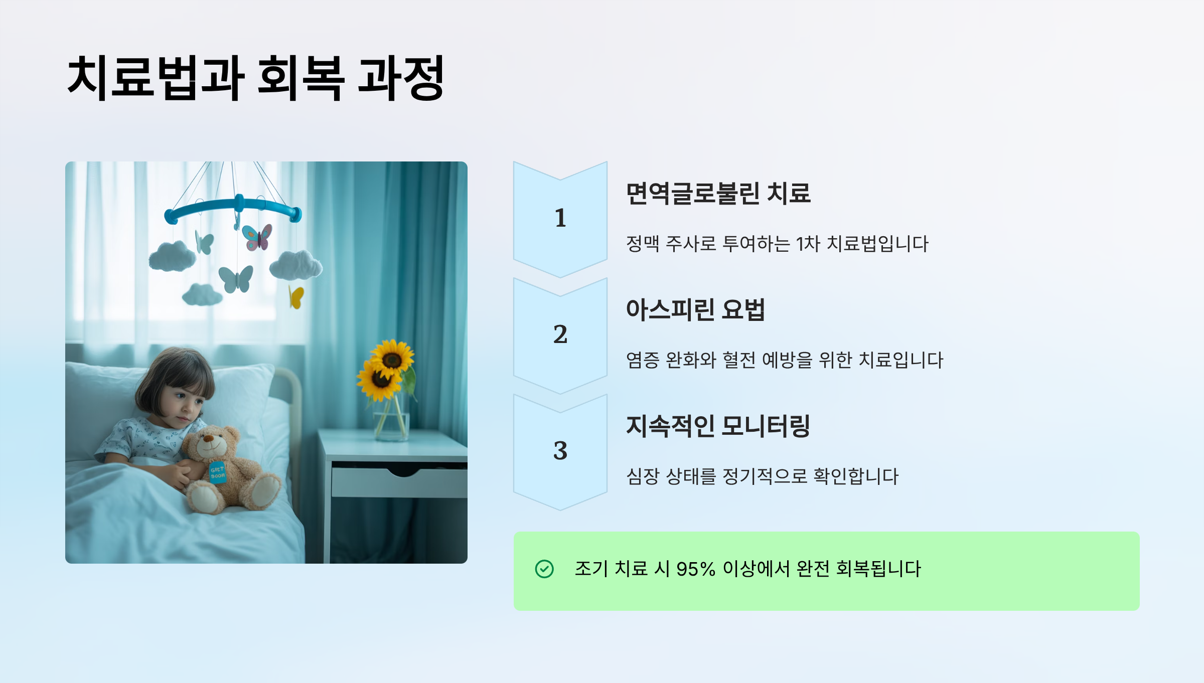 아이가 심장 합병증 없이 회복되었다면, 특별한 치료 없이도 건강하게 성장할 수 있어요. 하지만 관상동맥에 이상이 발견된 경우, **심장 전문의와의 지속적인 관리와 약물 치료**가 필요할 수 있어요.