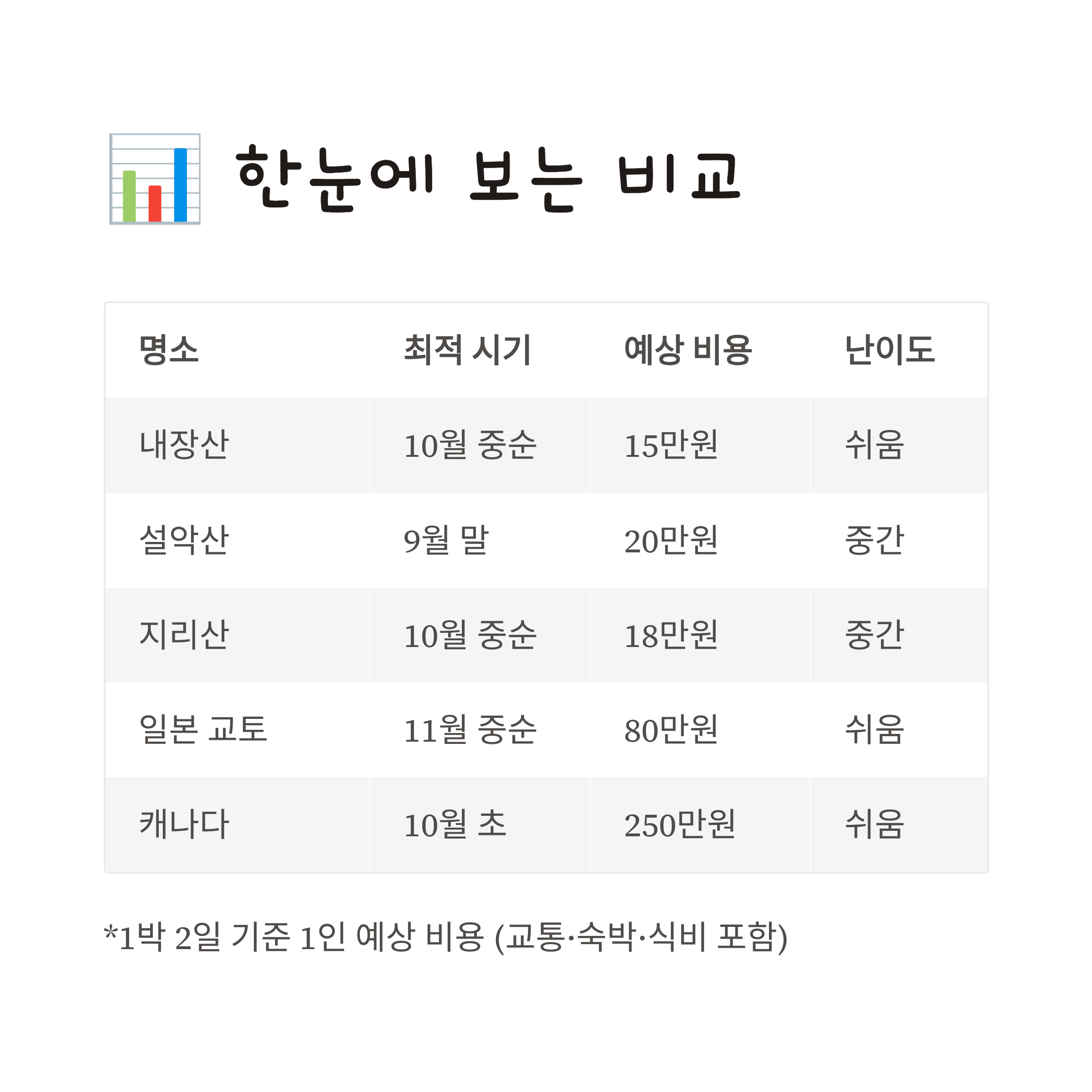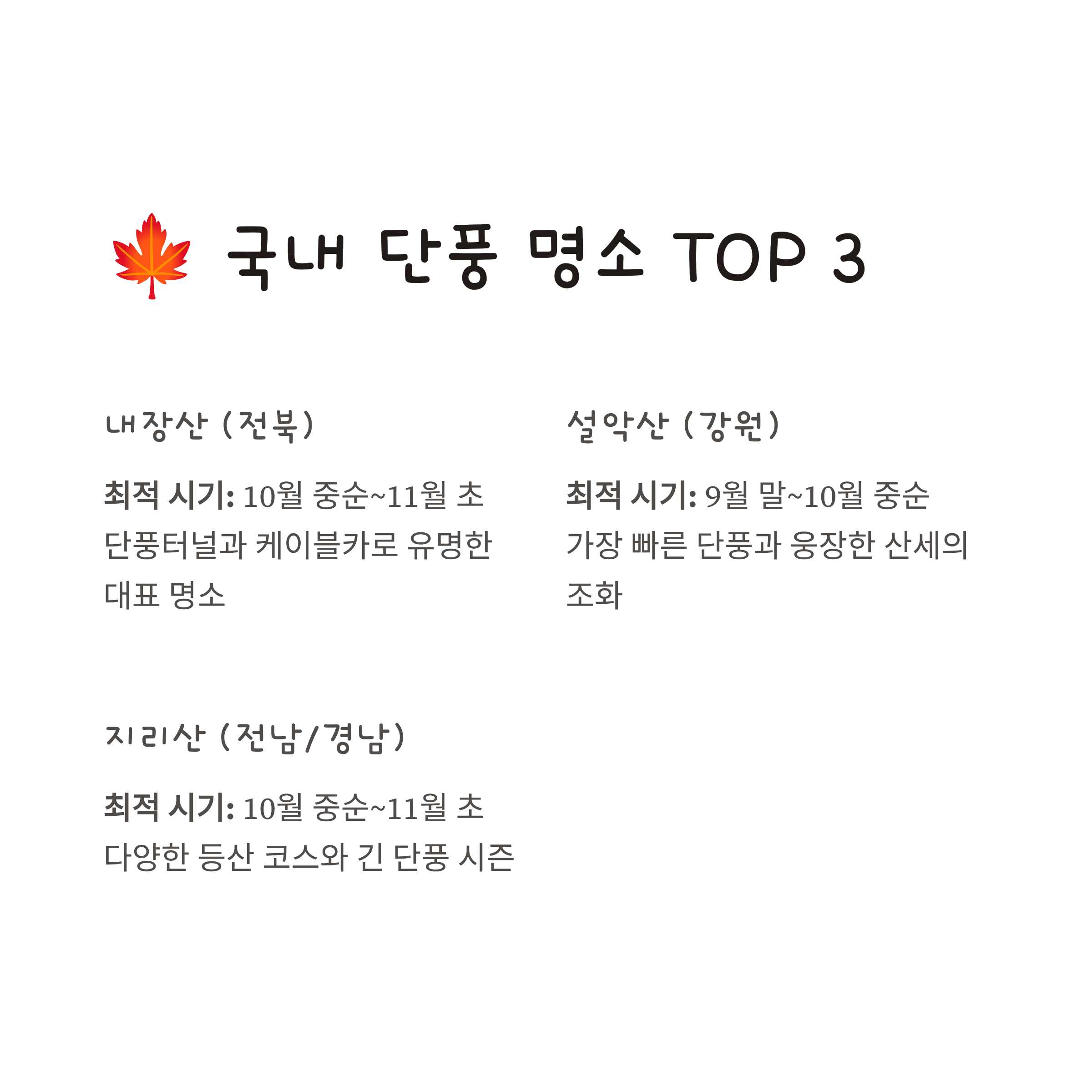| 국내 | 경주 불국사, 남이섬, 강릉 경포대 | 10월 중순~11월 초 | 출발지에 따라 1~3시간대 | 이른 시간 방문 권장, 대중교통 활용 |