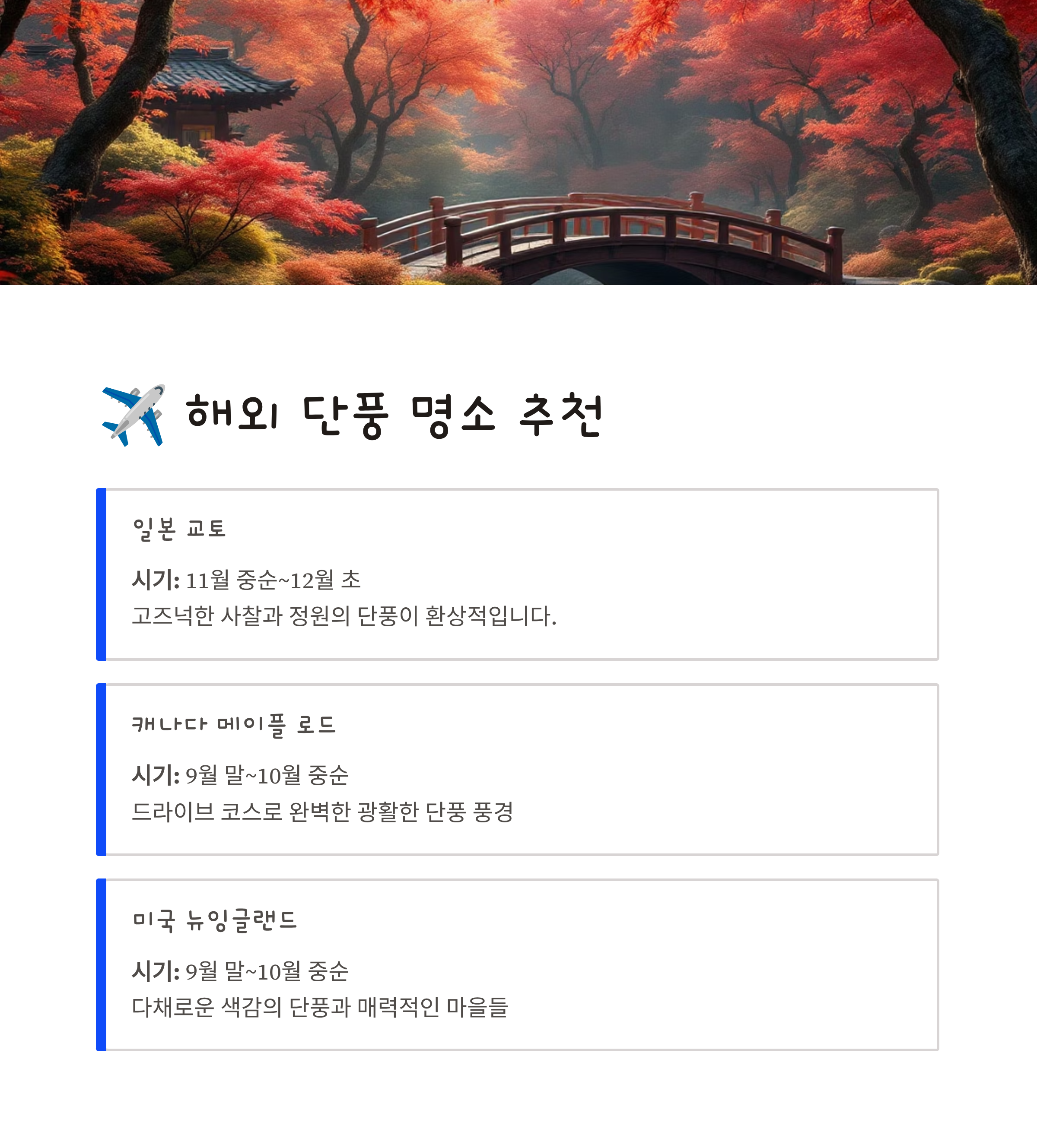 지금부터 국내외 단풍 구경 가을 여행의 모든 것을 함께 알아볼까요? 🍂✨