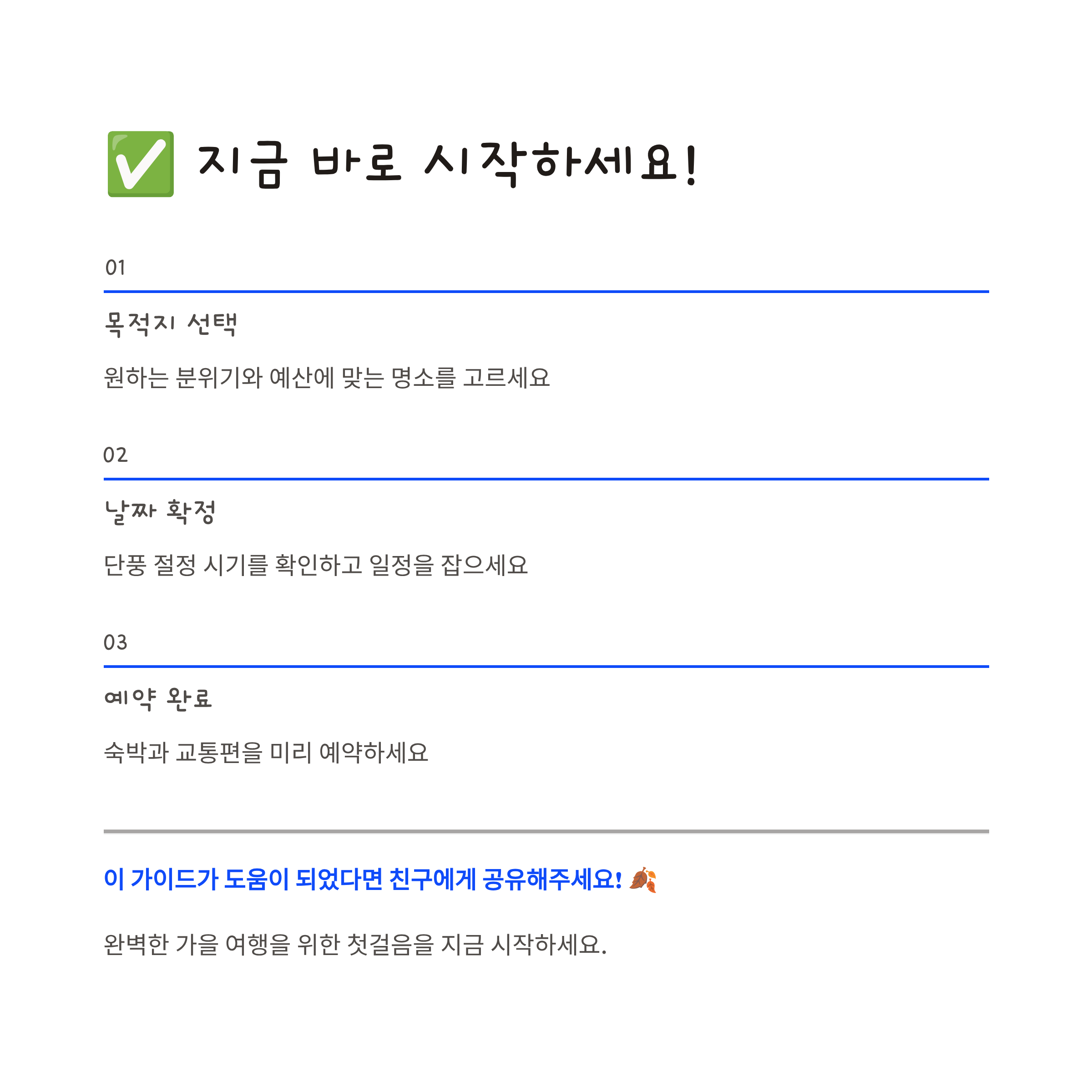 지금 바로 시작해보세요: 마음에 드는 코스를 골라 나만의 가을 단풍 여행 일정표를 만들어 보세요. 아래 코멘트에 선호 지역과 기간, 예산을 남겨 주시면 맞춤형 일정 아이디어를 드리겠습니다. 또한 업데이트되는 팁이나 이벤트 정보를 받으려면 뉴스레터를 구독해 보세요.