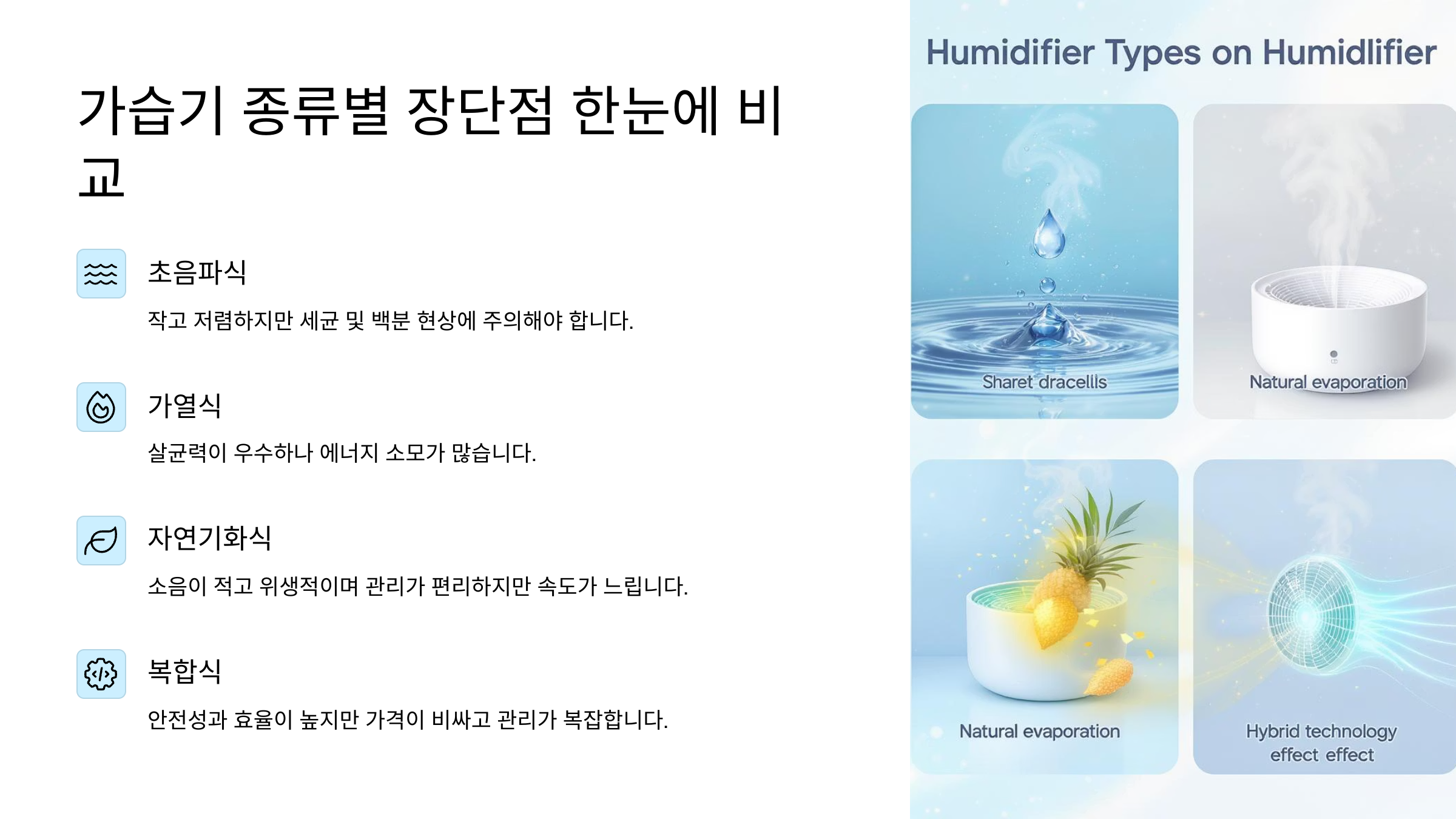 가정용 가습기는 원리와 방식에 따라 크게 네 가지로 나눌 수 있습니다. 각각의 장단점을 비교해보고, 우리 집에 맞는 제품을 선택하는 것이 중요합니다.