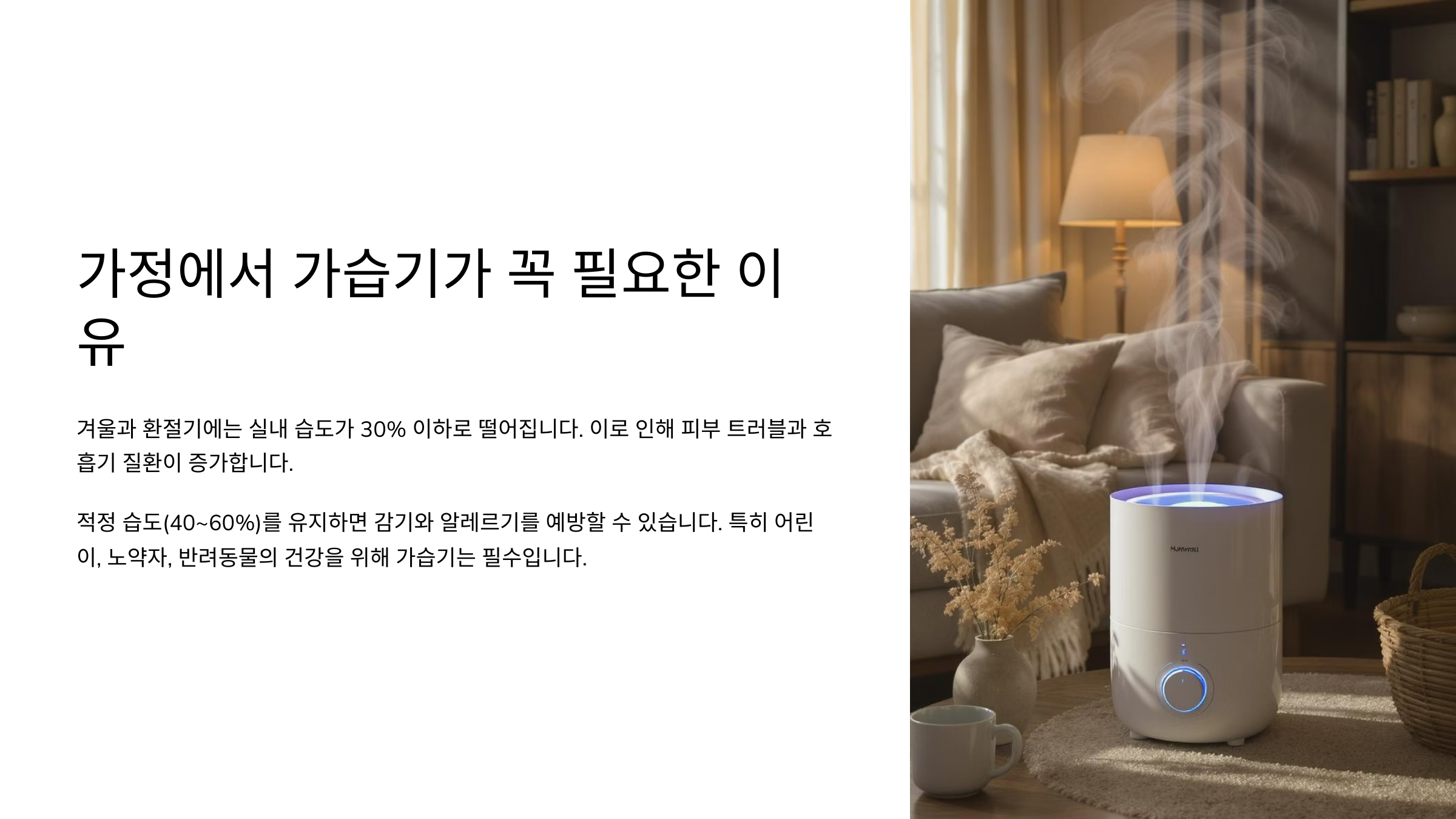 건조한 겨울철이나 환절기에는 실내 습도가 30% 이하로 떨어지는 경우가 많습니다. 이럴 때 가습기를 사용하면 호흡기 건강을 지키고, 피부 건조와 정전기를 예방할 수 있습니다. 특히 어린이나 노약자, 알레르기 환자에게는 적정 습도 유지가 필수입니다.