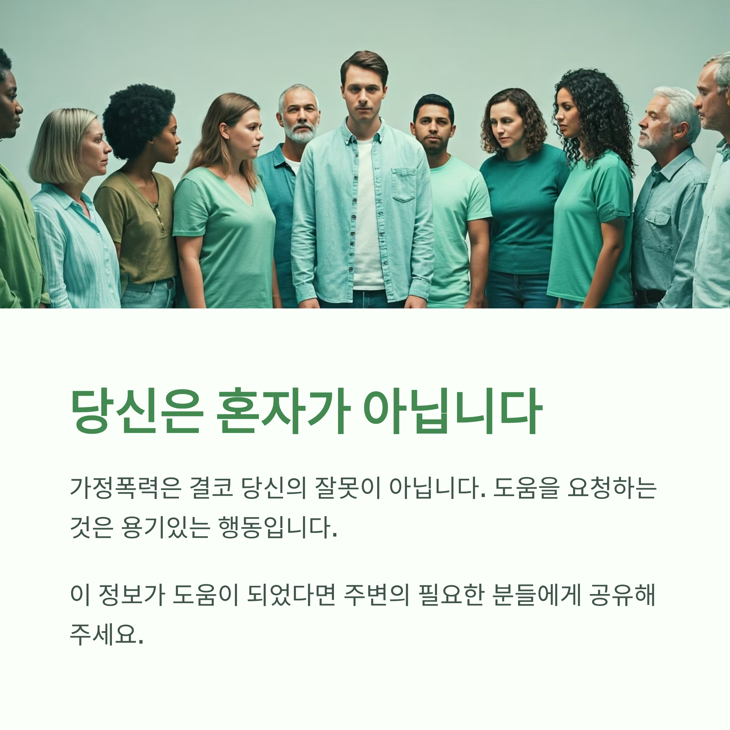 가정폭력은 혼자 해결할 문제가 아닙니다. 도움을 요청하는 것이 회복의 첫걸음입니다. 🤝