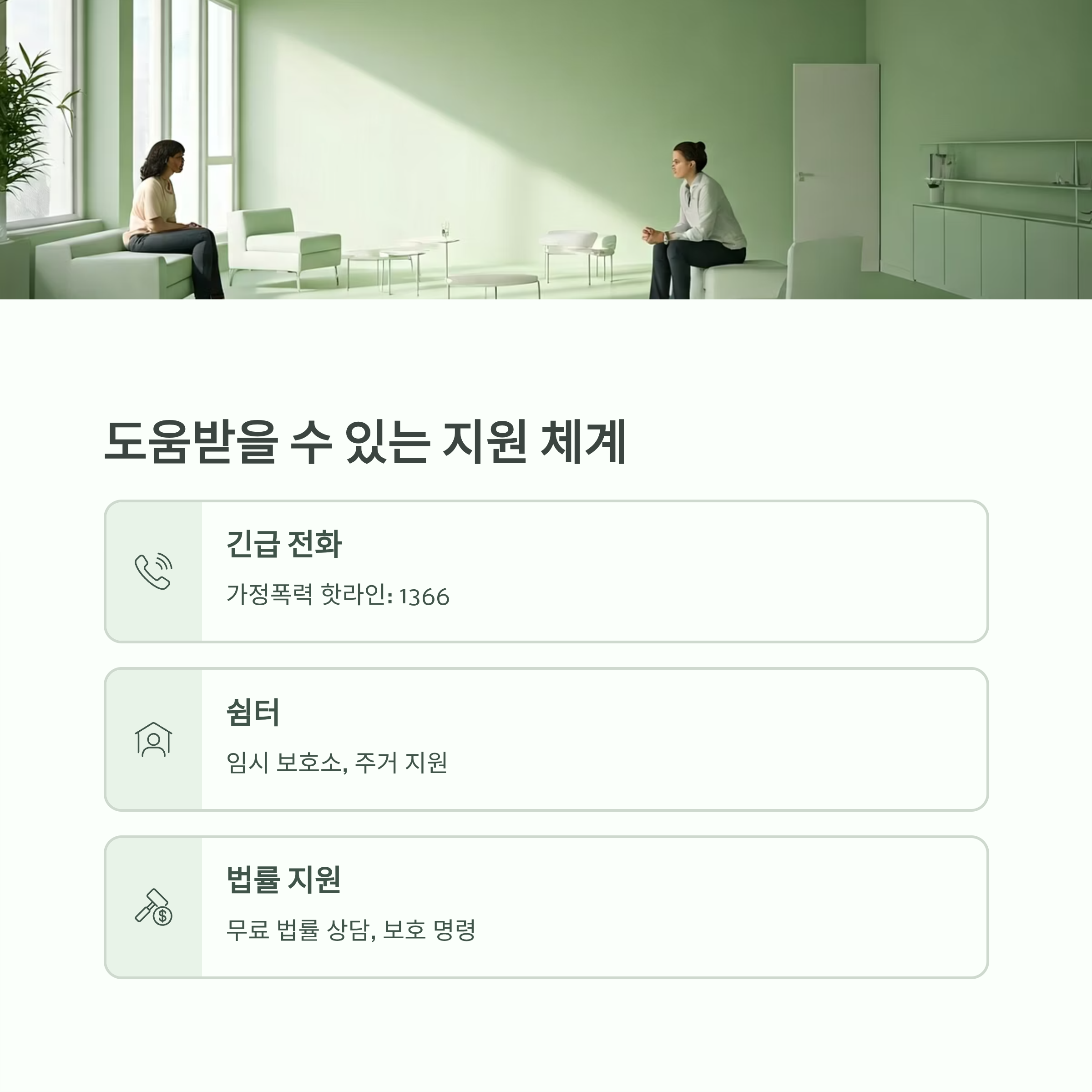 가정폭력 피해자는 혼자 고민하지 말고, 다양한 지원 체계를 활용해 도움을 받아야 합니다. 한국에는 피해자를 보호하고 회복을 돕는 체계가 잘 마련되어 있습니다.