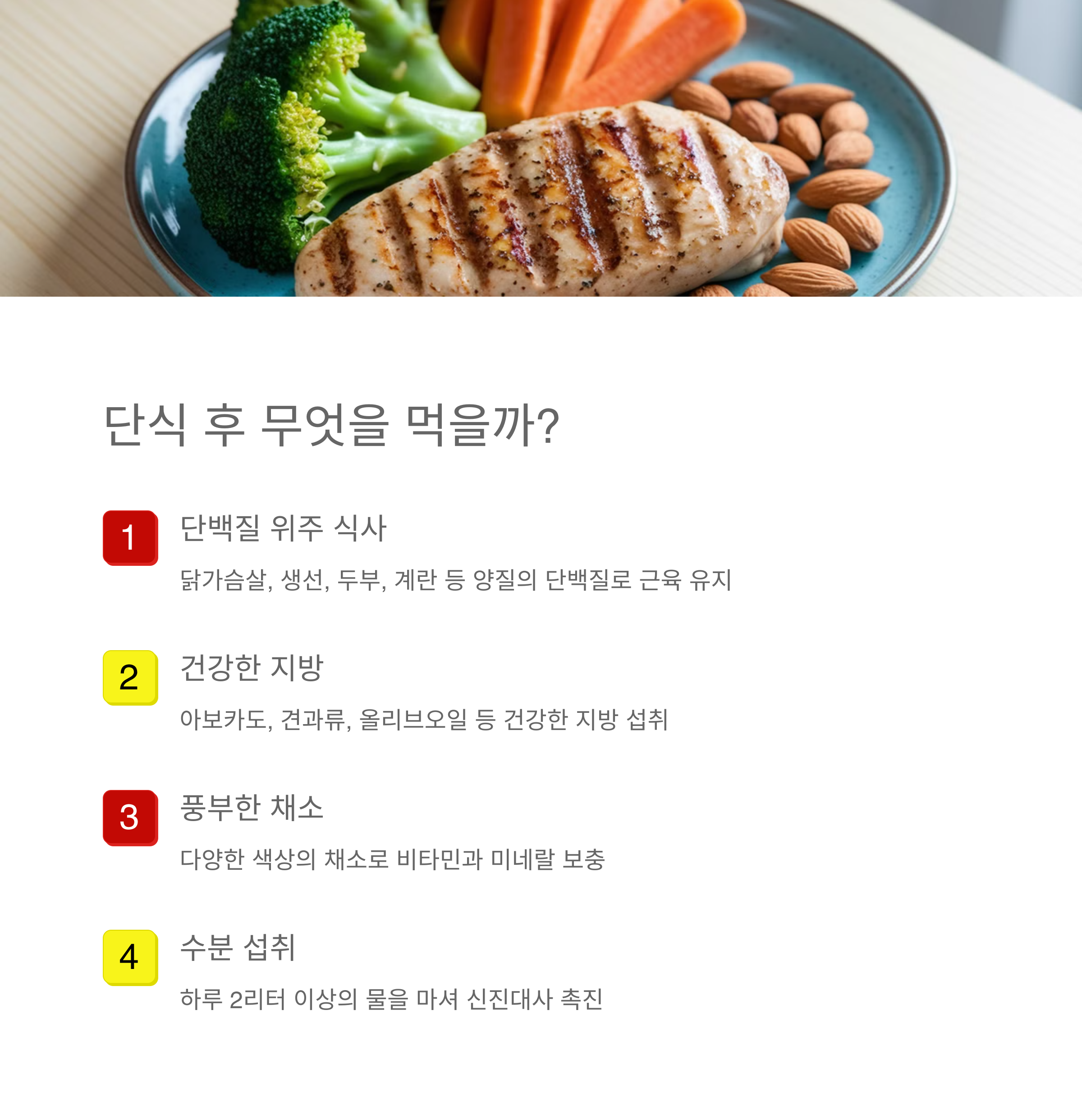 단식 후에는 단백질, 건강한 지방, 섬유질이 풍부한 음식을 섭취하는 것이 좋습니다. 예를 들면 달걀, 아보카도, 견과류, 연어, 채소 등이 적합합니다. 가공식품과 설탕이 많은 음식은 피하는 것이 중요합니다.