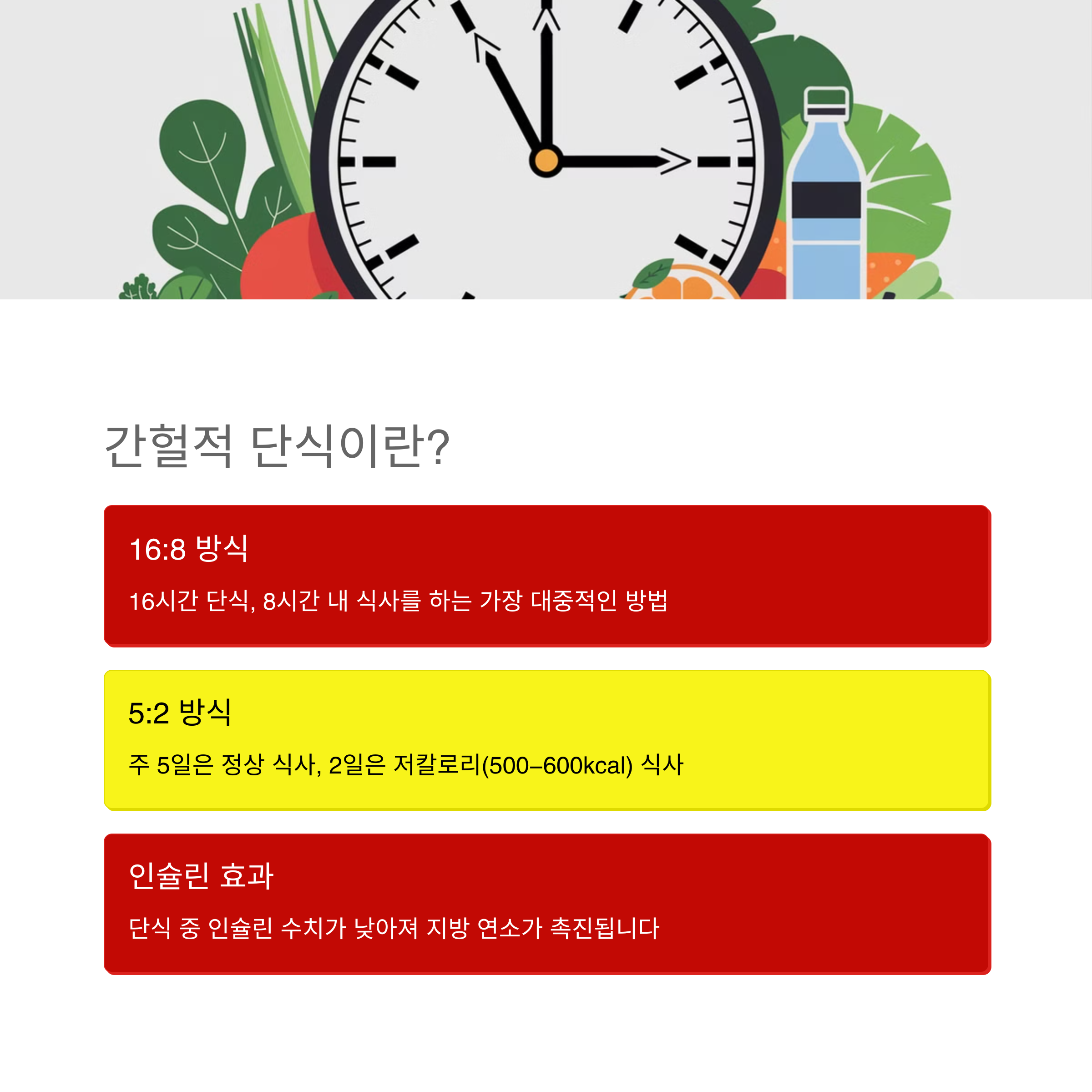 | 간헐적 단식이란? | 일정 시간 동안 단식을 유지하는 식습관 |