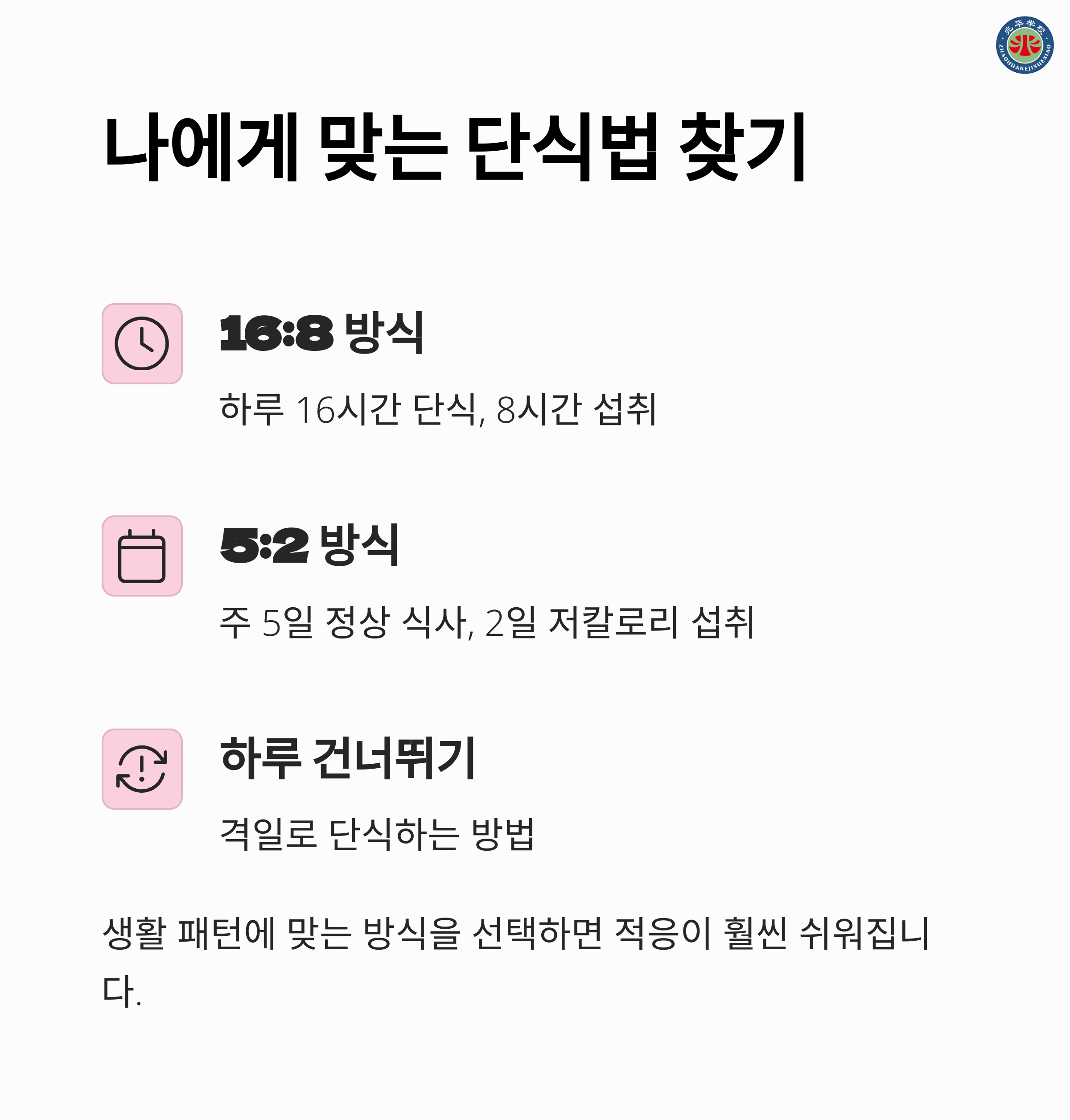 | 16:8, 5:2, 하루 건너뛰기 | 단백질 + 건강한 지방 + 채소 | 수분 섭취 & 규칙적인 루틴 |