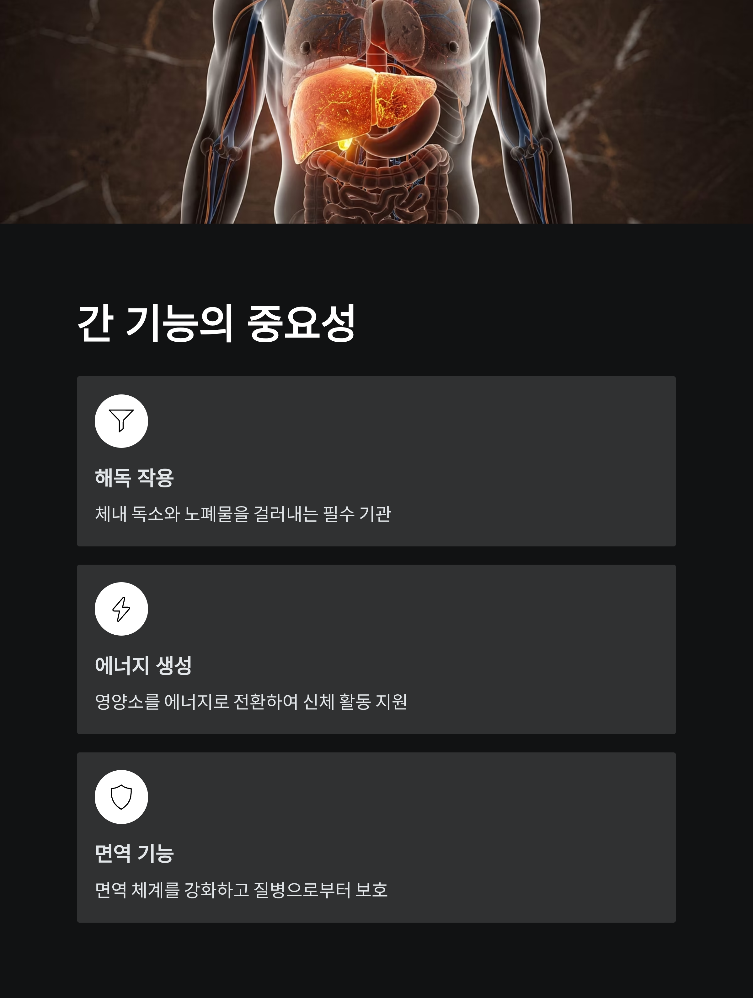 간은 해독, 단백질 합성, 면역 조절 등 생명 유지에 필수적인 500가지 이상의 중요한 역할을 담당합니다. 간 기능이 떨어지면 소화 불량, 심한 피로, 황달, 그리고 심각할 경우 지방간이나 간경변까지 초래할 수 있습니다.