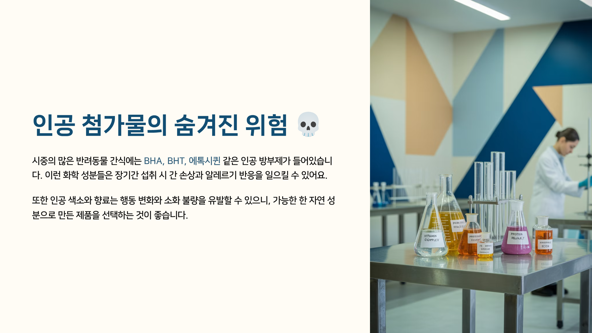 강아지 간식에서 가장 많이 발견되는 위험 요소 중 하나가 바로 ‘인공 첨가물’이에요. 색깔을 더 예쁘게 만들고, 오래 보관되도록 하기 위해 사용되지만, 강아지의 몸에는 독처럼 작용할 수 있어요. 특히 장기간 섭취할 경우 더 큰 문제를 일으킬 수 있죠.