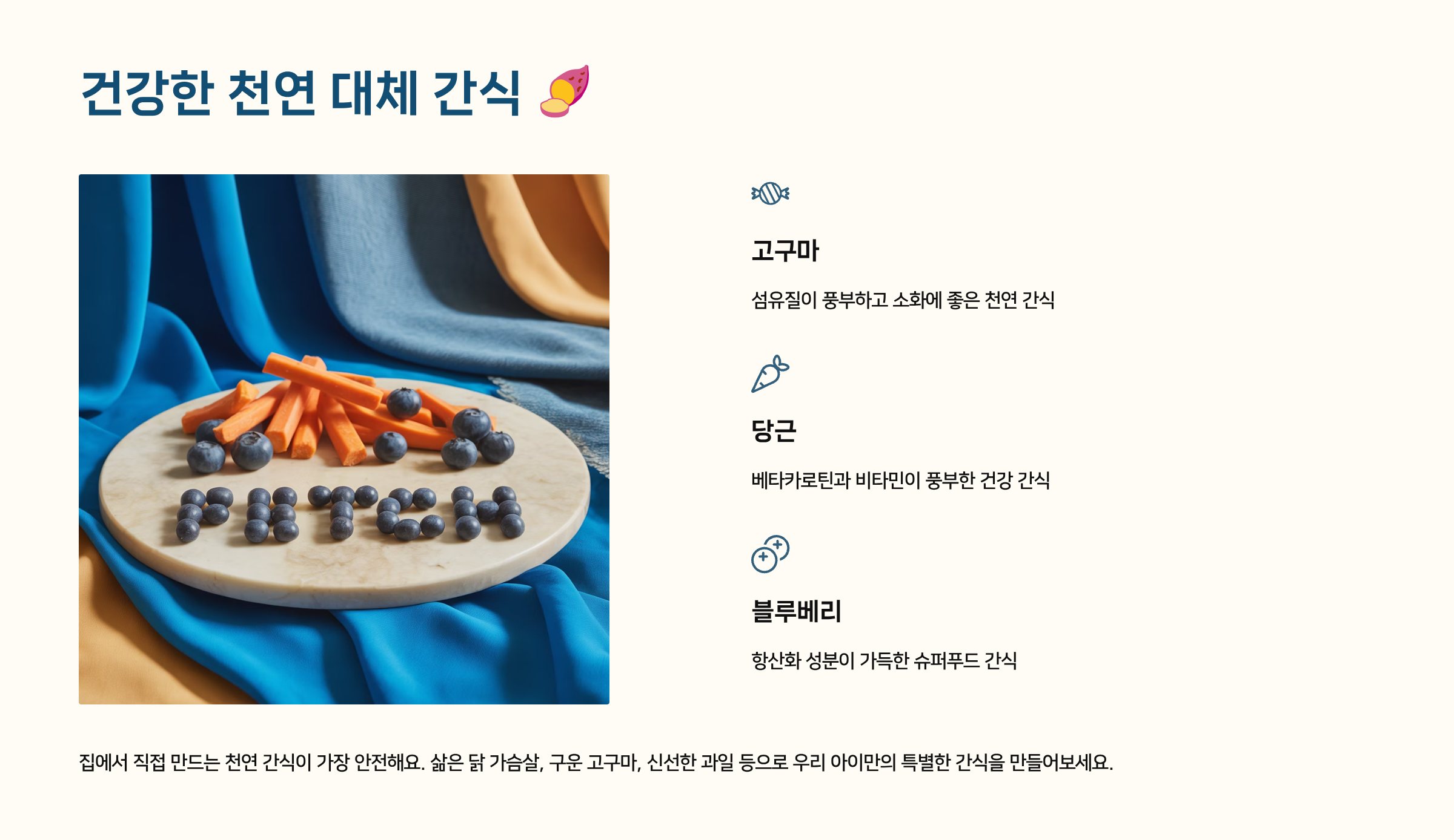 성분표를 잘 보는 습관은 아이의 건강을 지키는 첫걸음이에요. 지금은 어려워도 계속 보다 보면 익숙해지고, 나중엔 단번에 좋은 간식을 고를 수 있게 될 거예요. 다음은 진짜 건강에 좋은 대체 간식 성분을 추천해드릴게요! 🍠🥩