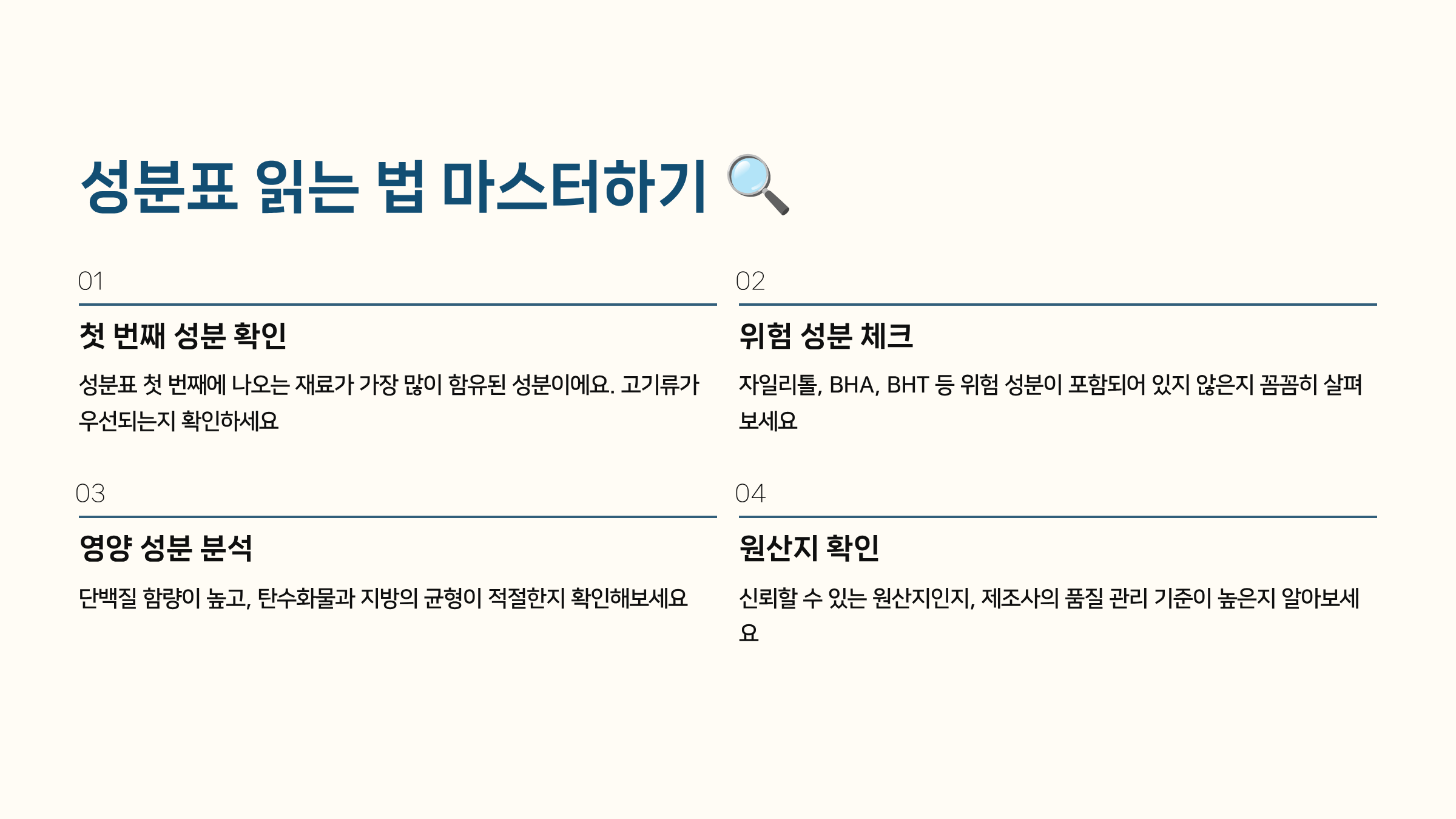건강을 생각한다면 단맛이 강하거나 짠 간식은 가급적 피하는 게 좋아요. 다음은 성분표를 꼼꼼히 읽는 방법과 확인해야 할 핵심 체크포인트를 알려드릴게요! 🧐
