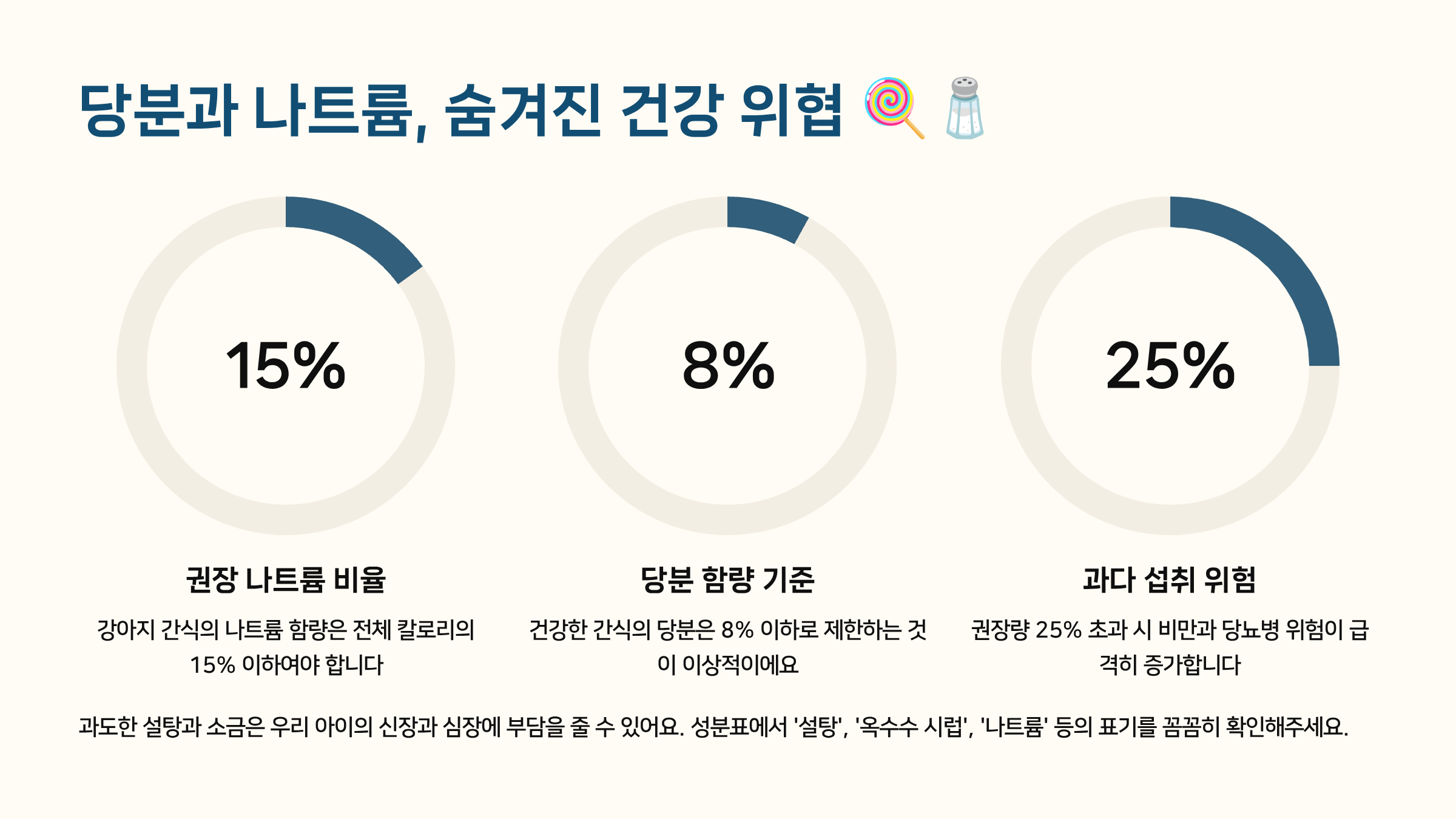 이런 성분이 들어간 간식은 되도록 피하고, ‘무첨가’, ‘자연 성분’, ‘사람이 먹을 수 있을 정도의 등급’을 기준으로 고르는 것이 좋아요. 다음 섹션에서는 우리가 흔히 놓치는 당분과 나트륨 문제에 대해 알아볼게요! 🍭🧂