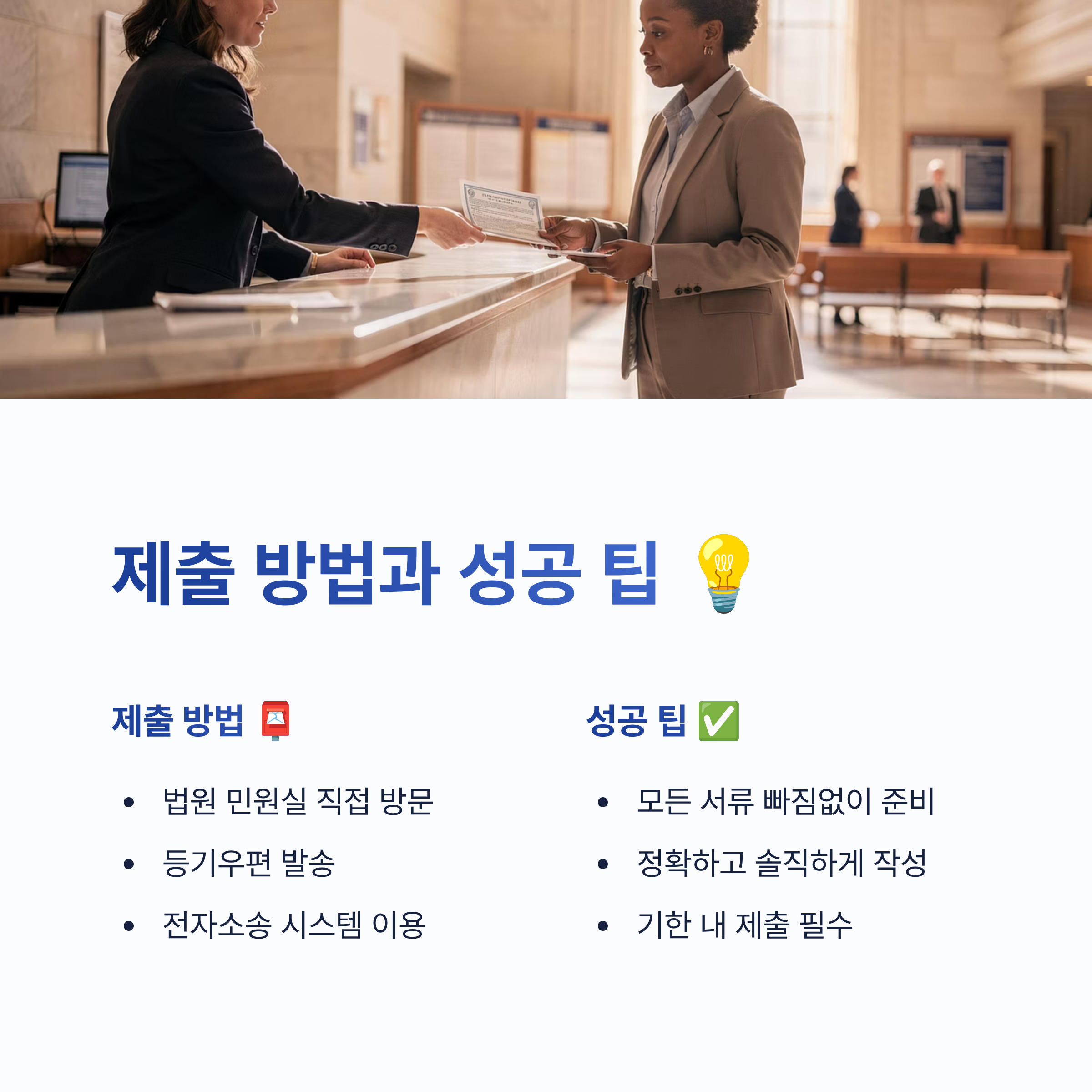 • 법률사무실 대리 제출: 이전에 개인회생 절차를 진행했던 법률사무실에 의뢰하여 대리 제출을 요청할 수 있습니다. (별도 수수료 발생 여부 확인)