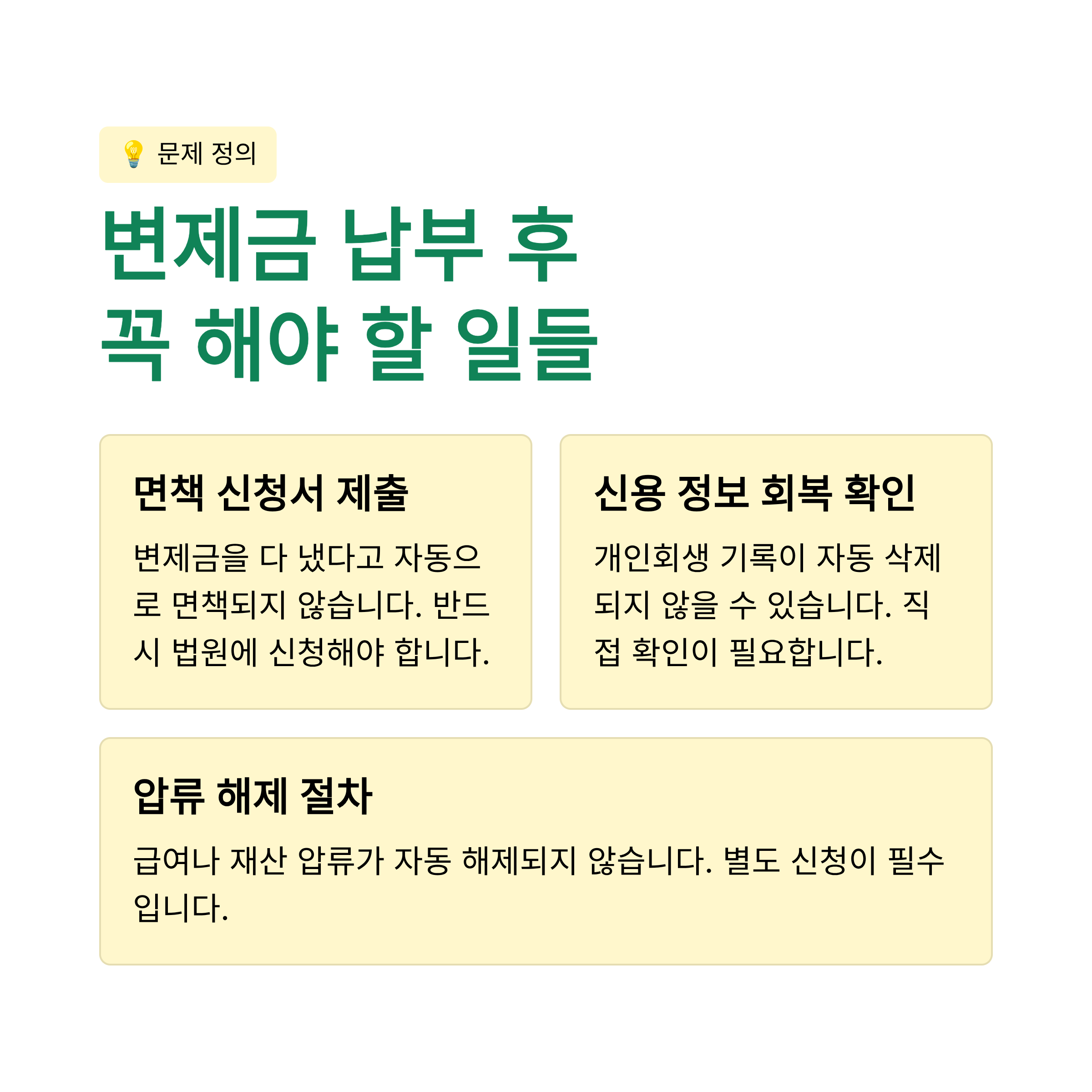- 해결 약속: 변제금 완납 후 반드시 해야 할 3가지 핵심 절차(면책 신청, 신용 정보 확인, 압류 해제)를 명확히 제시하여, 당신의 개인회생을 성공적으로 마무리하고 새로운 경제적 시작을 할 수 있도록 안내합니다. 또한 면책 후 신용회복 과정과 소요 시간까지 상세히 알려드립니다.