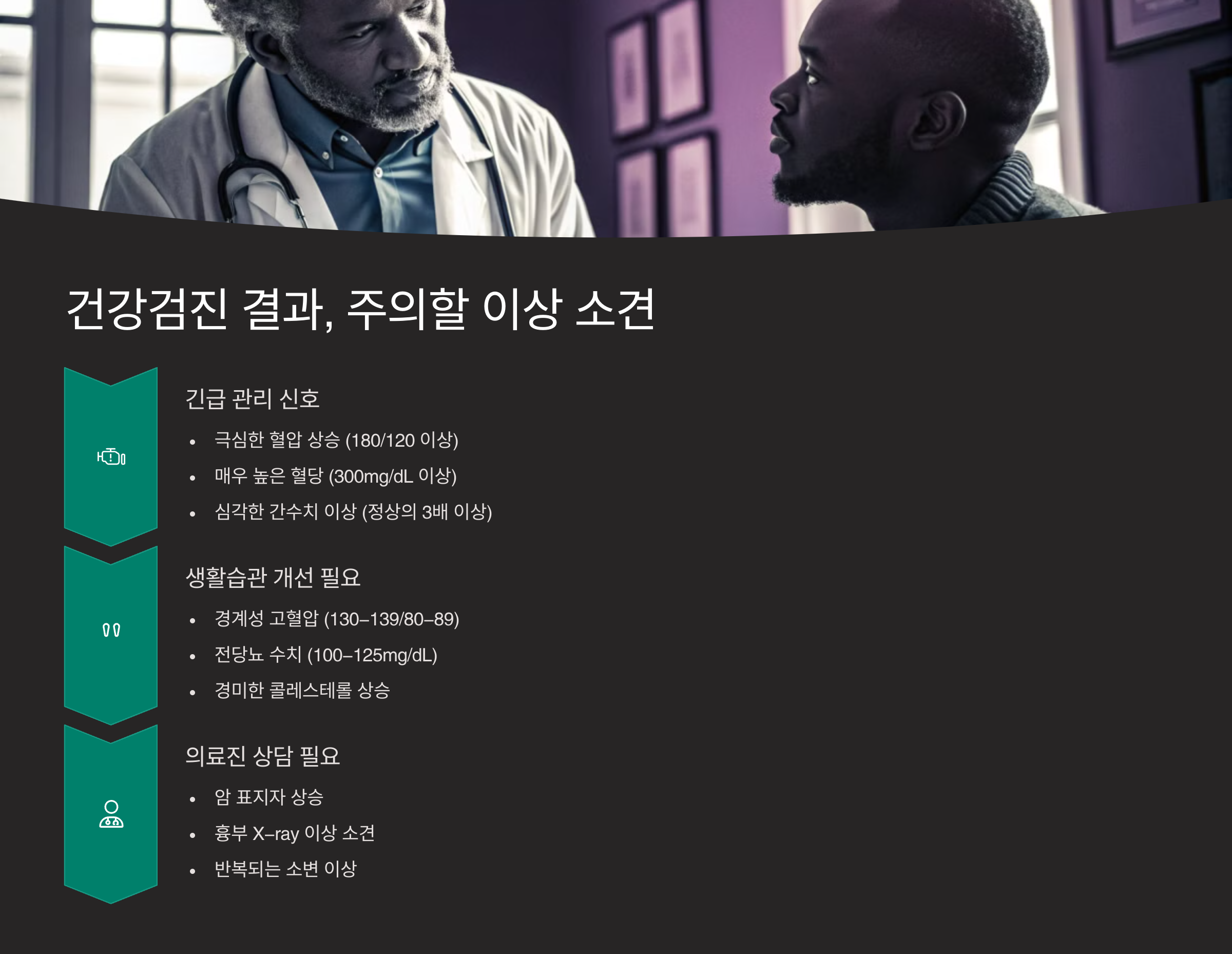 검진 결과지를 무조건 불안해하지 말고, 이상이 나왔을 때는 다음과 같이 대응하는 게 좋아요: