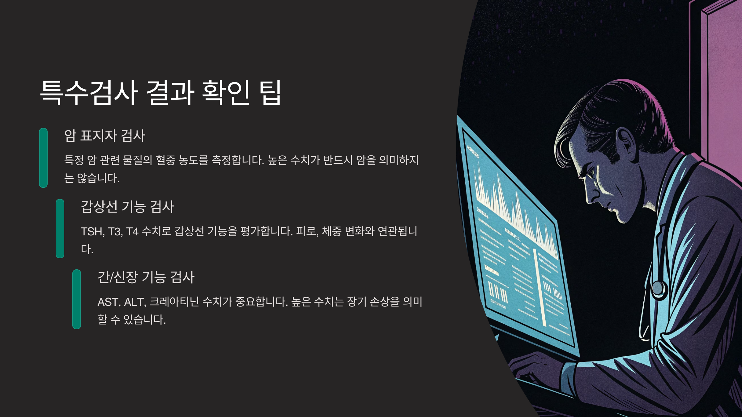특수검사는 주로 암이나 만성질환의 조기 발견에 초점을 맞춘 검사라서, 1회로 끝나지 않고 결과에 따라 이후 정기적으로 받게 되는 경우도 있어요. 결과지에 나온 의학용어가 어렵다면 병원에서 상담을 받아보는 게 가장 정확해요. 😊