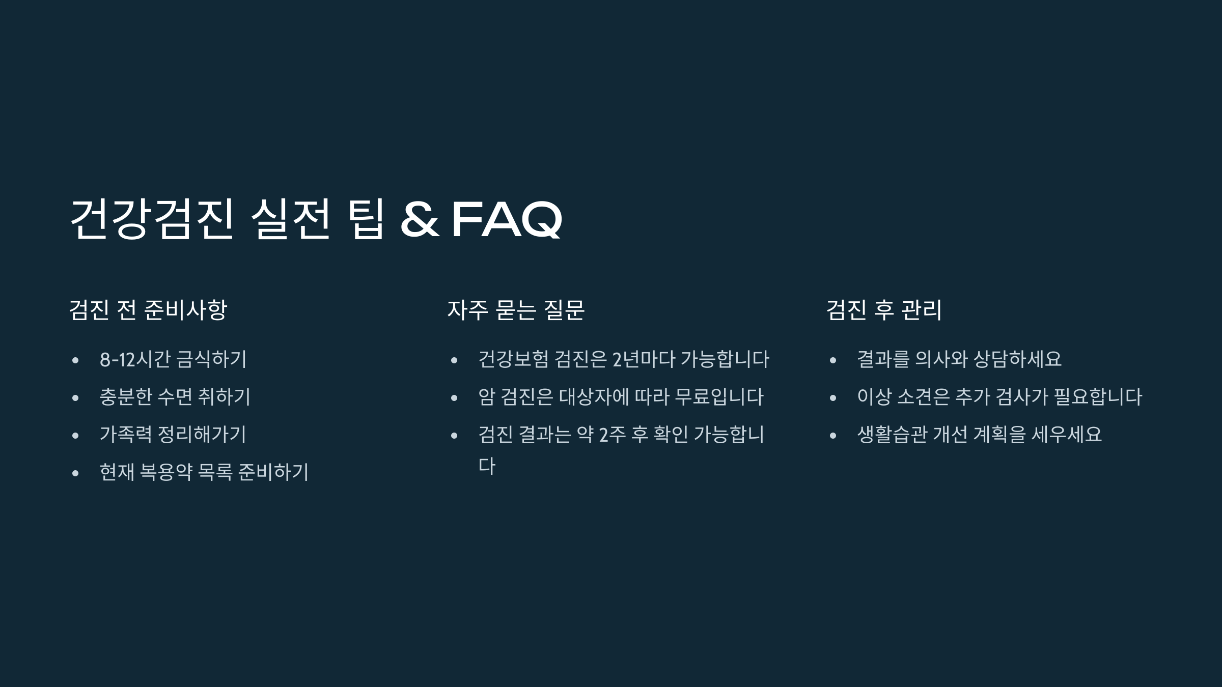 가족력·생활습관 반영: 가족력, 비만, 흡연, 음주, 만성질환 등 위험요인에 따라 맞춤형 검진 항목을 추가하세요.