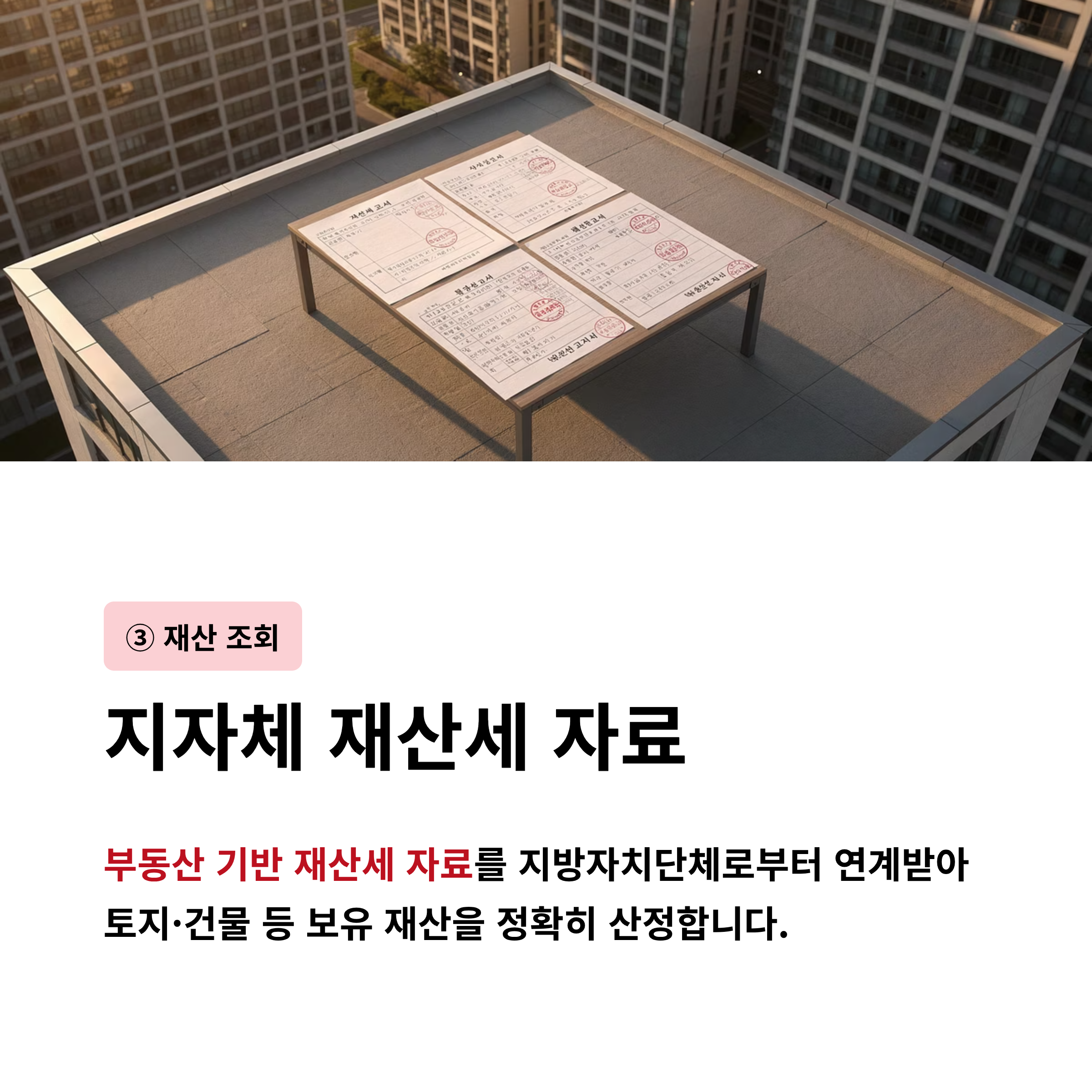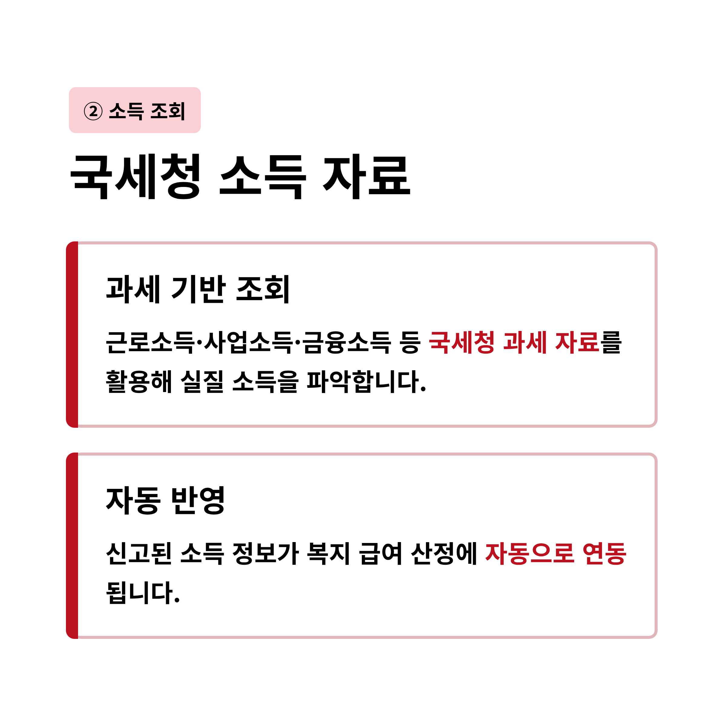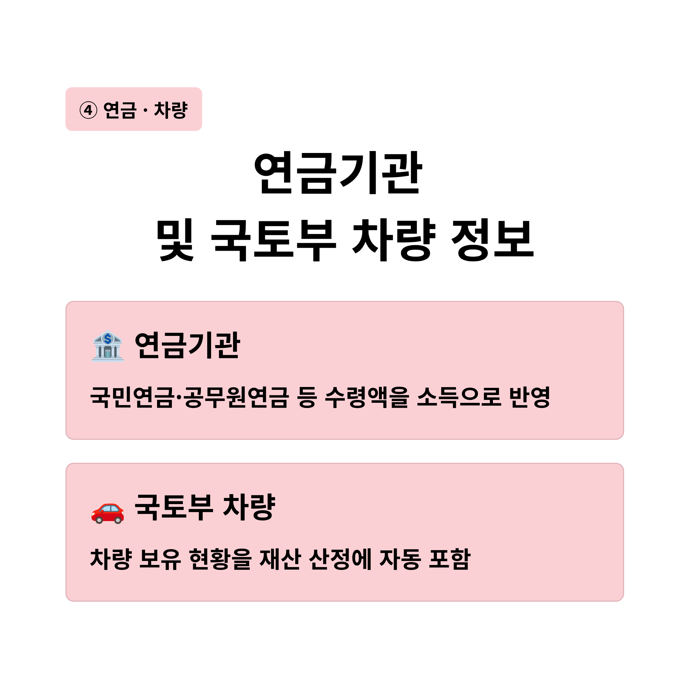 1) 범정부 사회보장정보시스템 연계 2) 국세청 소득 자료 (과세 기반) 3) 지자체 재산세 자료 (부동산 기반) 4) 연금기관 및 국토부 차량 정보 5) 데이터 변동 시 조정 신청 요령1) 범정부 사회보장정보시스템 연계