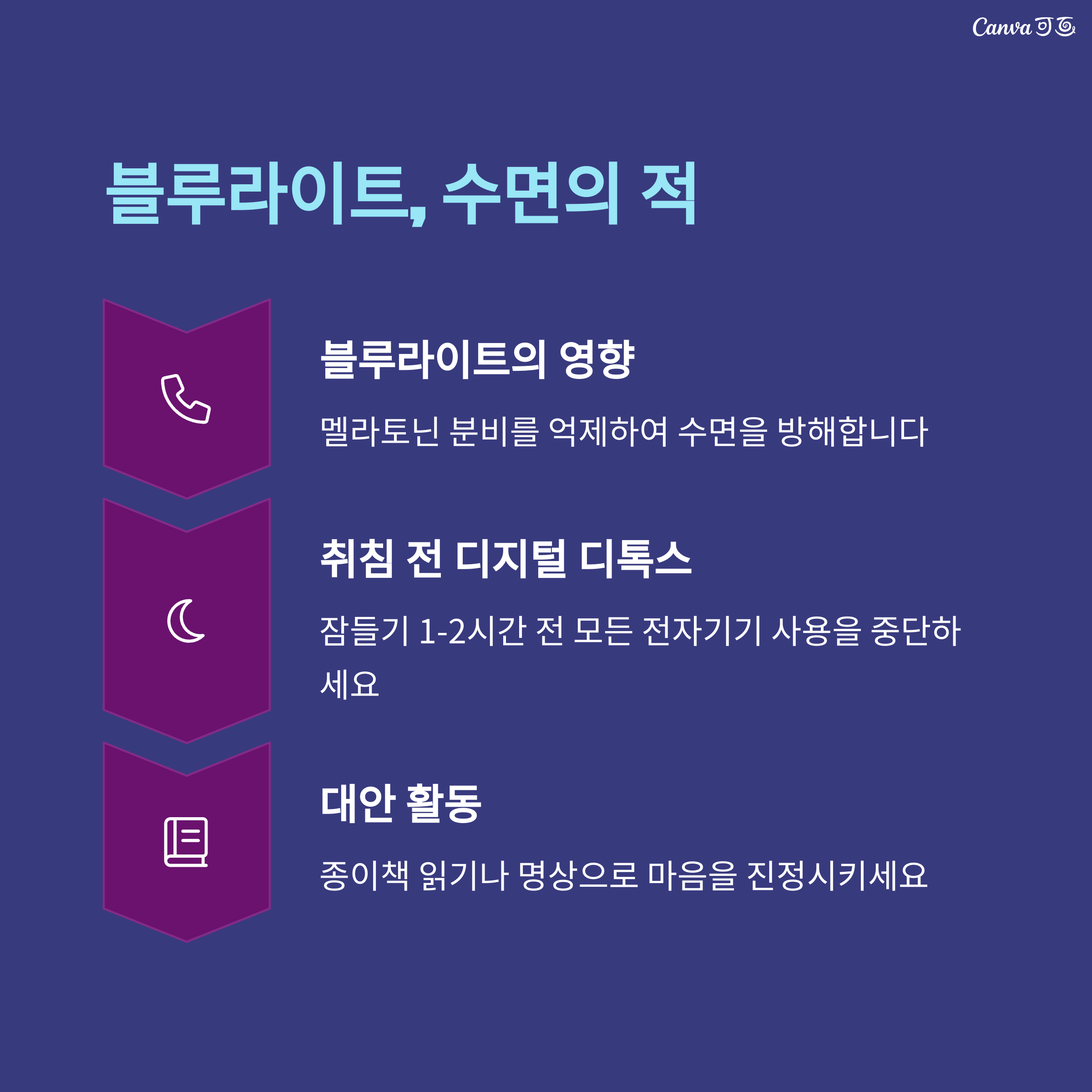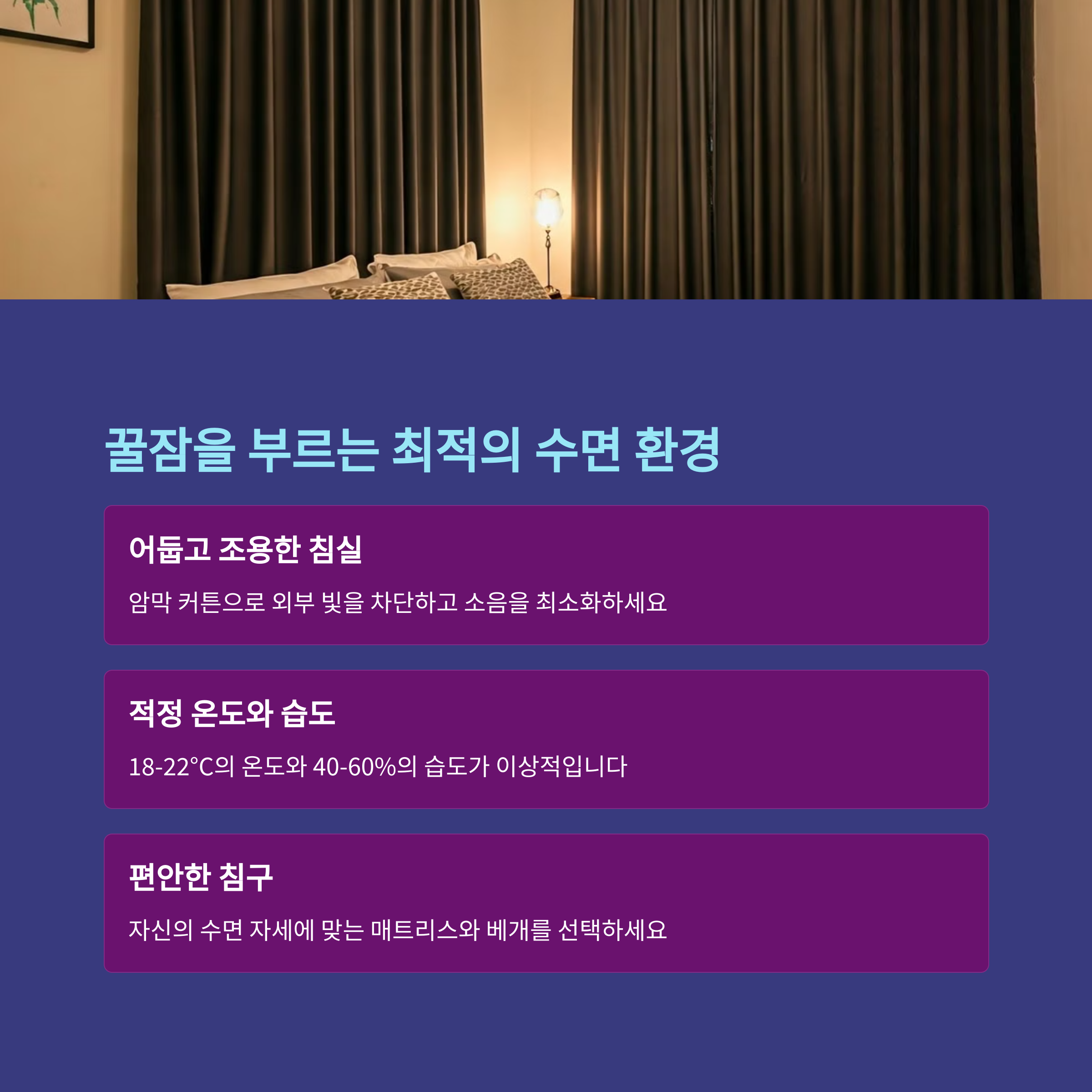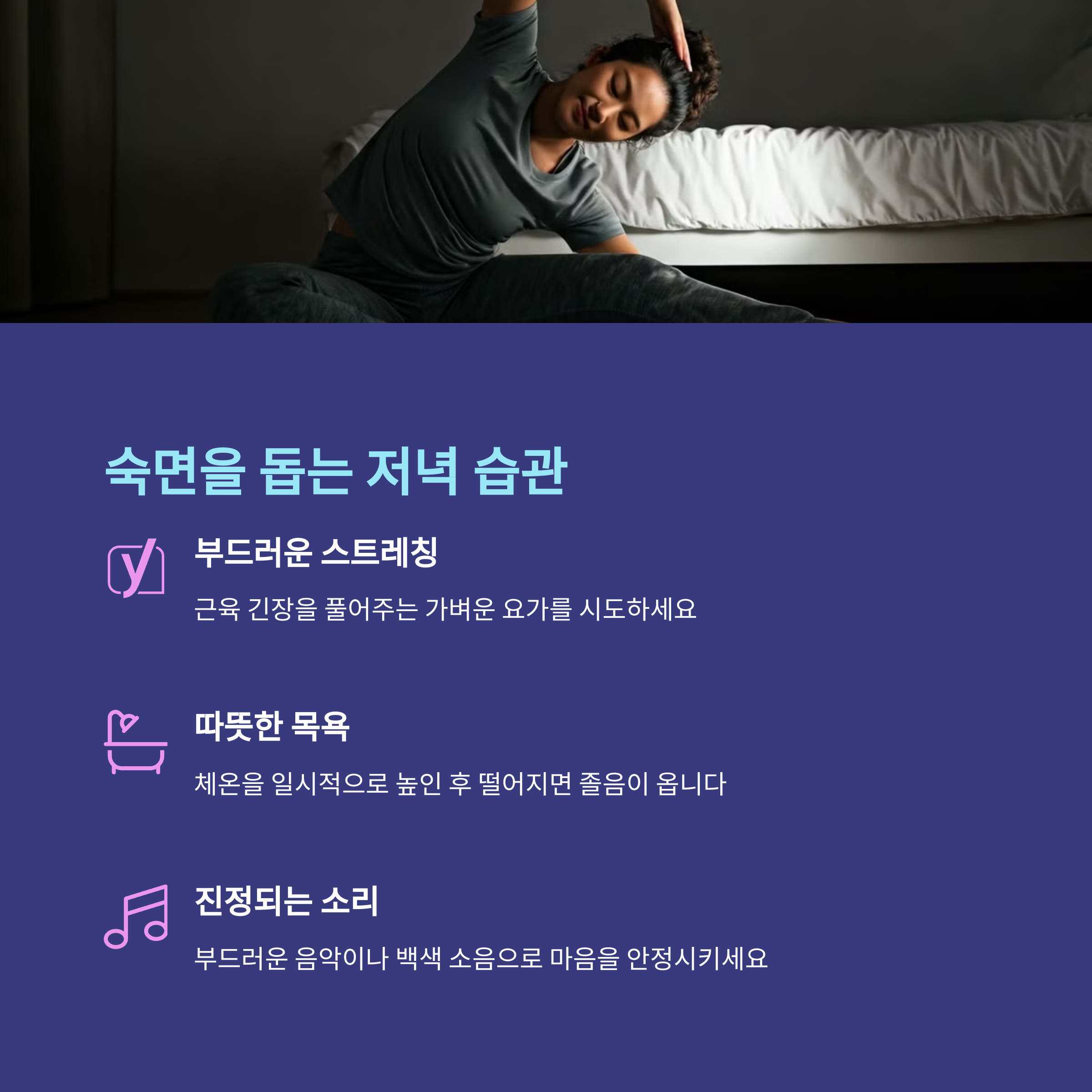| 매일 같은 시간에 자고 일어나는 습관 | 조용하고 어두운 환경에서 수면 | 자기 전 30분 스마트폰 사용 자제 |