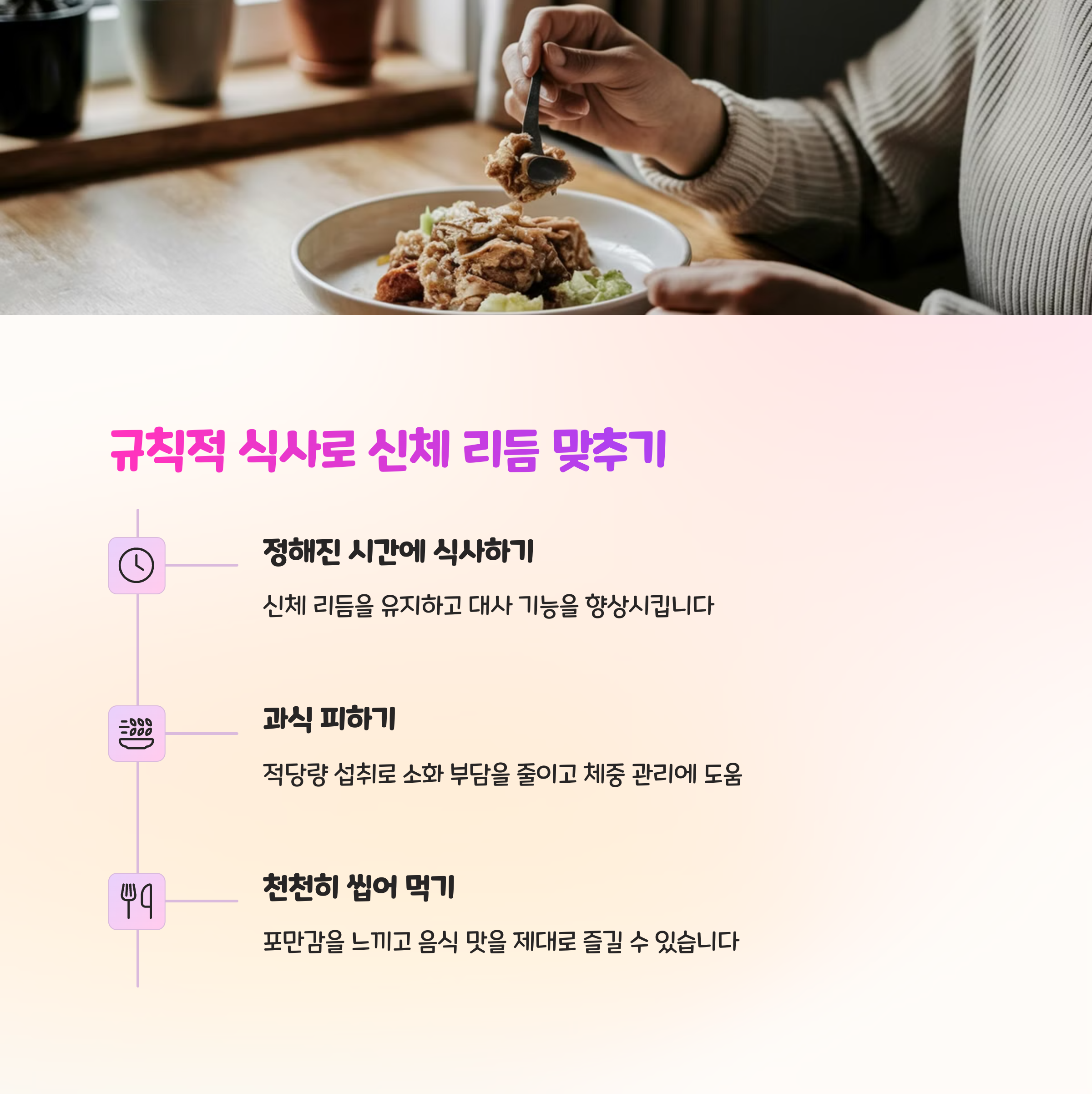 | 정해진 시간 식사 | 일정한 시간에 규칙적으로 식사하는 습관을 들이세요. |