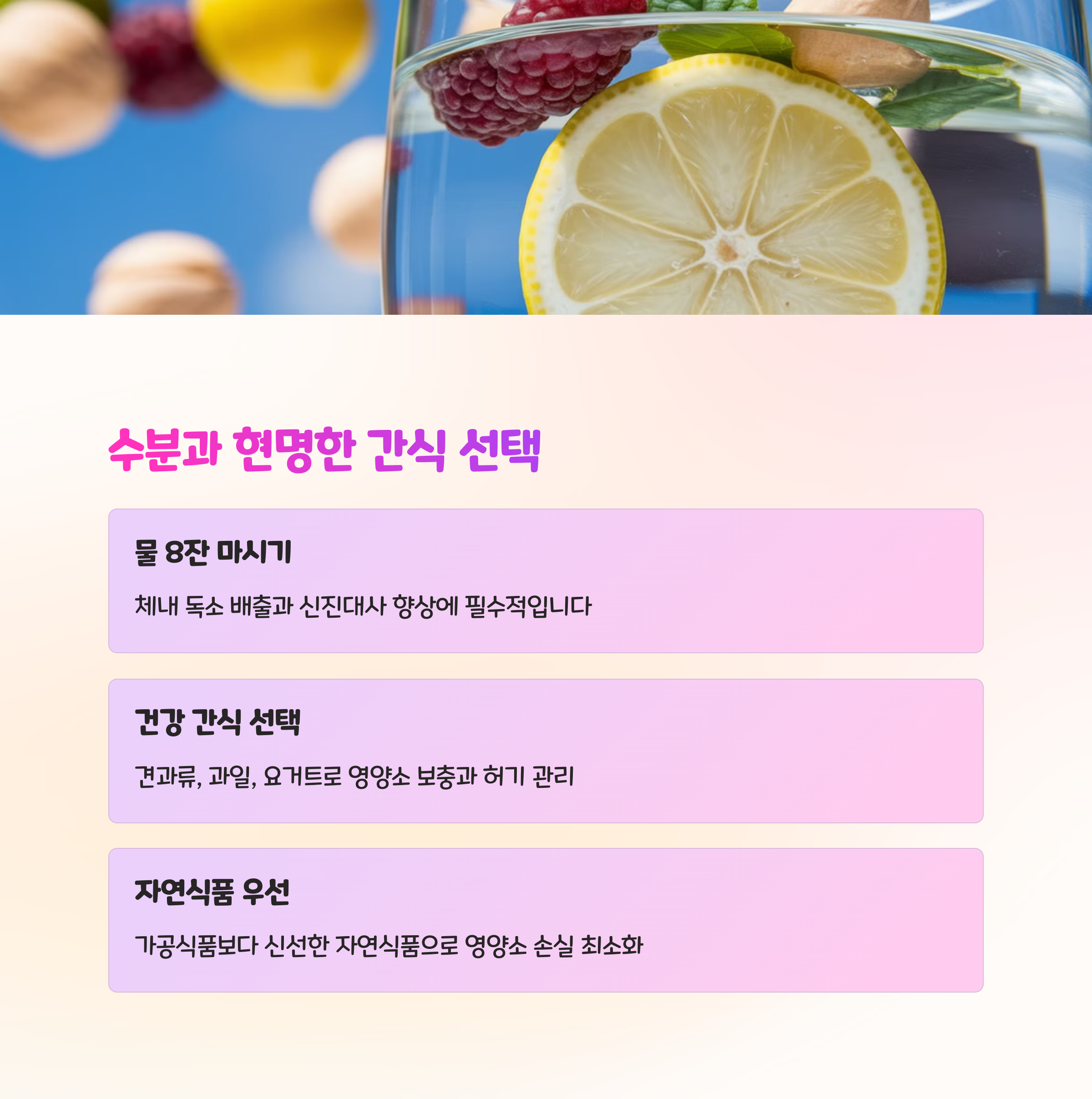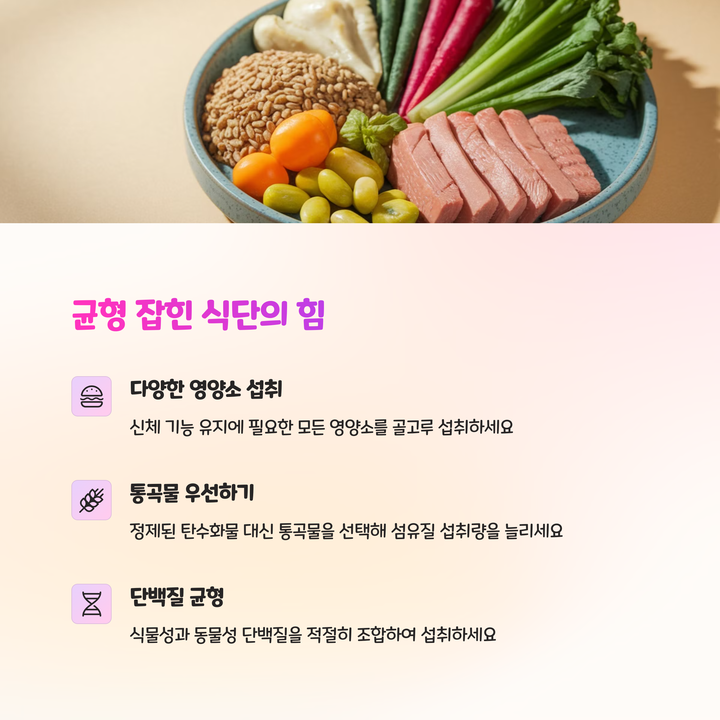 | 균형 잡힌 식단 | 탄수화물, 단백질, 지방의 비율을 고르게 맞추세요. |