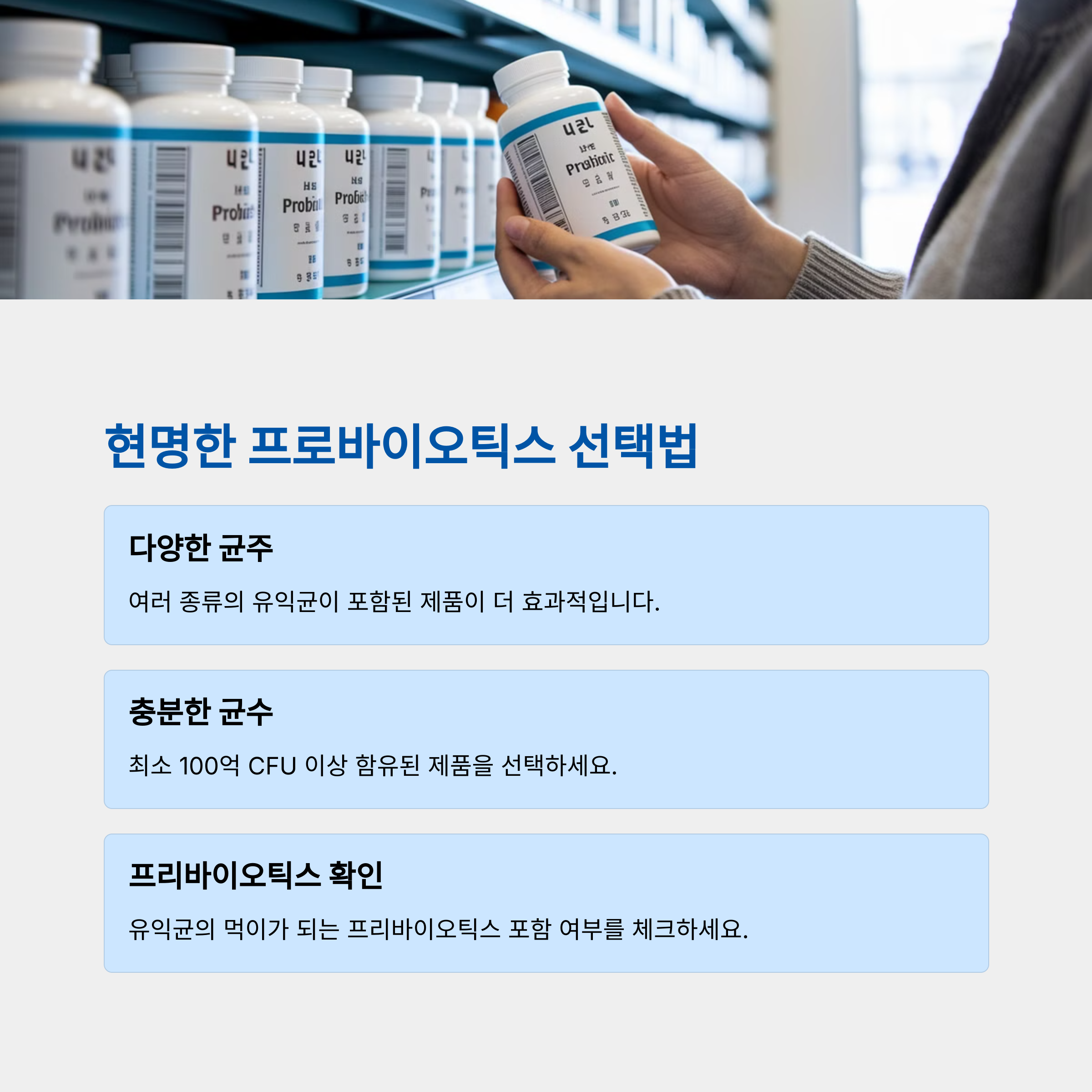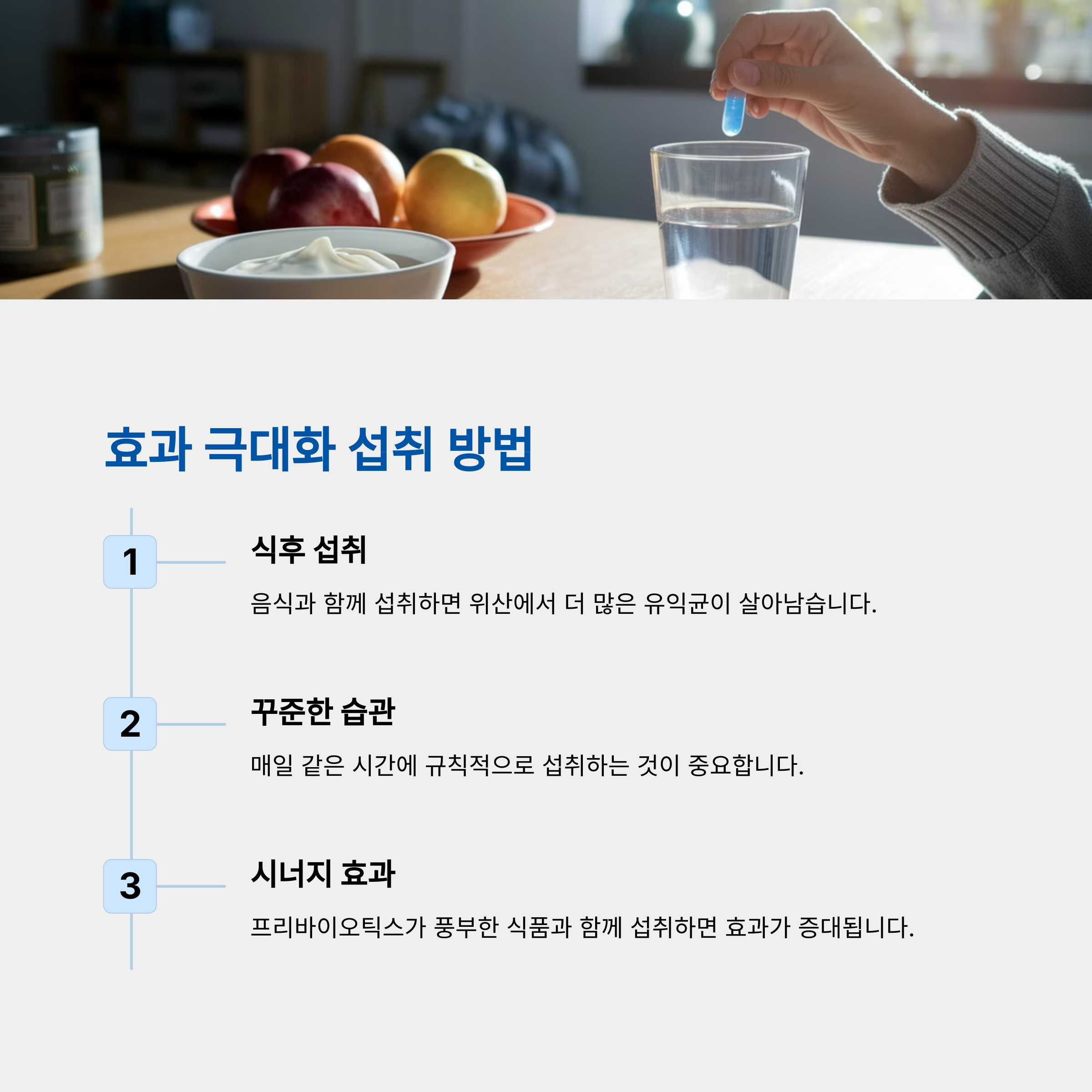 | 다양한 균주를 조합해야 효과적 | 100억 CFU 이상을 보장하는 제품 추천 | 섬유질이 풍부한 식단과 함께 섭취 |