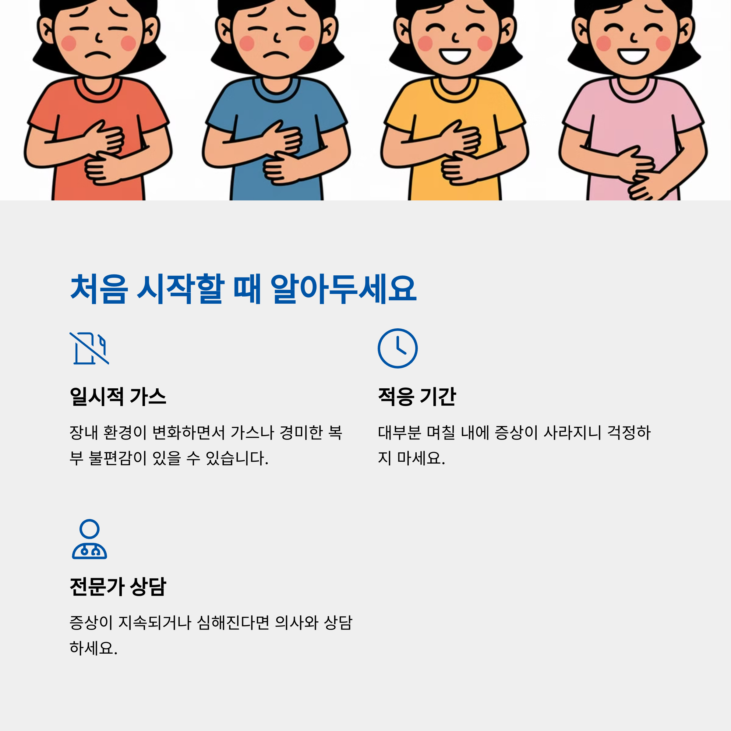 일부 사람들은 처음 섭취 시 가스 발생이나 배변 변화를 겪을 수 있습니다. 이는 장내 환경이 조정되는 과정이며, 대부분 며칠 내로 안정됩니다. 그러나 증상이 지속된다면 섭취량을 조절하거나 전문의와 상담하는 것이 좋습니다.