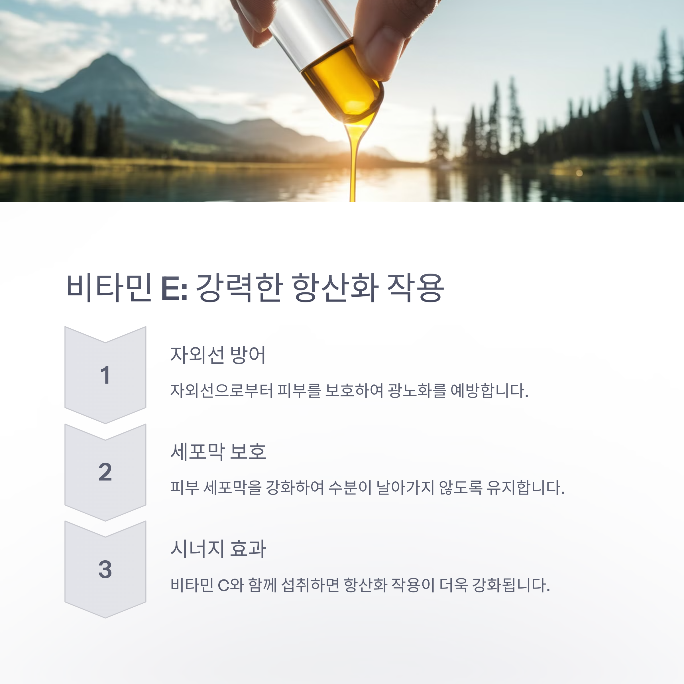 마지막으로, 비타민 E는 피부의 노화를 예방하고, 피부에 영양을 공급하는 중요한 역할을 합니다. 비타민 E는 피부의 수분 손실을 방지하고, 건조하고 거친 피부를 부드럽게 만들어줍니다. 또한, 강력한 항산화 성분을 통해 피부를 외부 유해 환경으로부터 보호합니다.