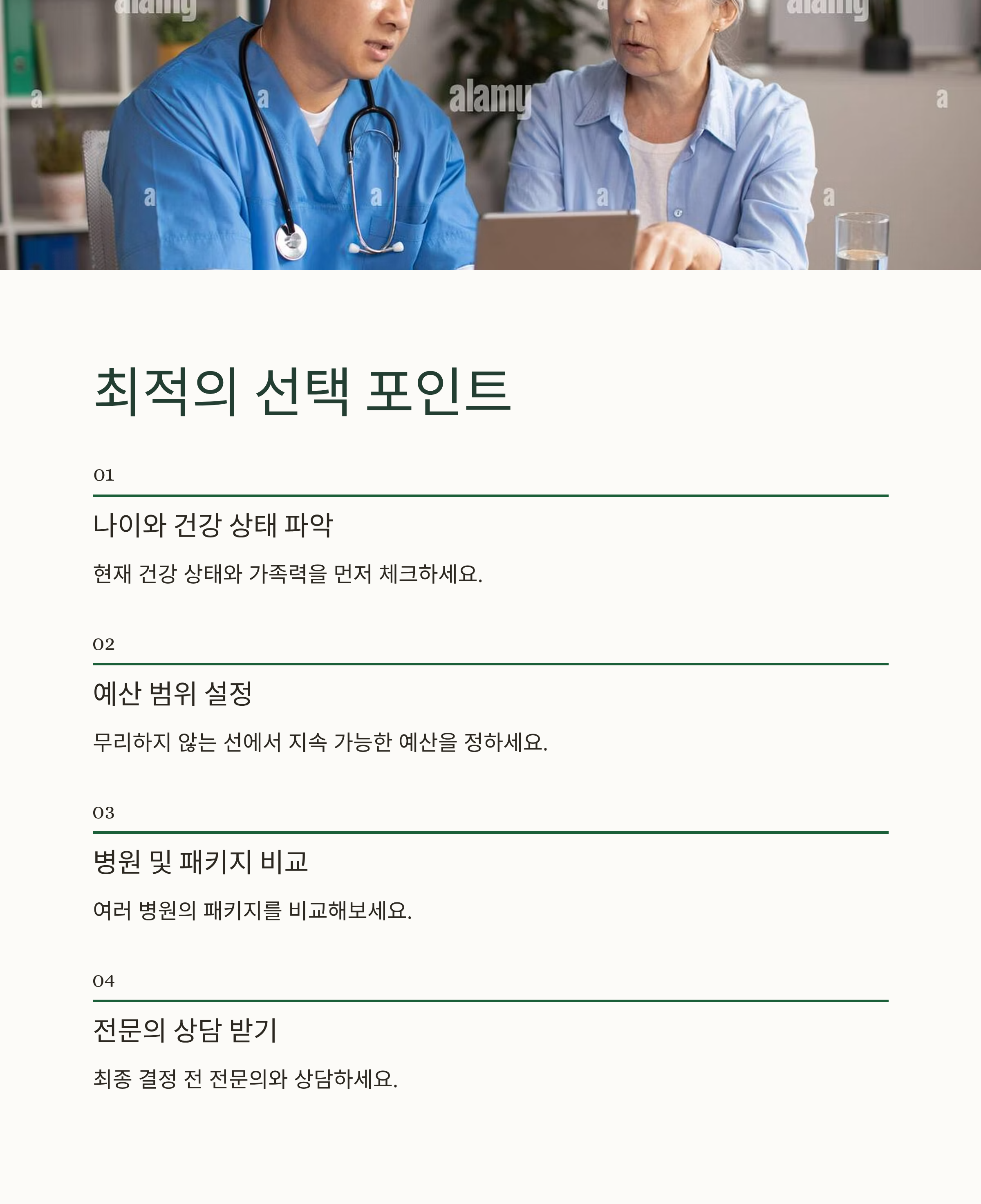 - 무조건 비싼 패키지가 좋은 것은 아닙니다. '기본형'으로 시작하되, 건강 상태나 가족력에 따라 의사 상담을 통해 '표준형' 또는 '프리미엄형'의 특정 항목을 추가하는 방식으로 예산과 필요성 사이의 균형을 맞춥니다.