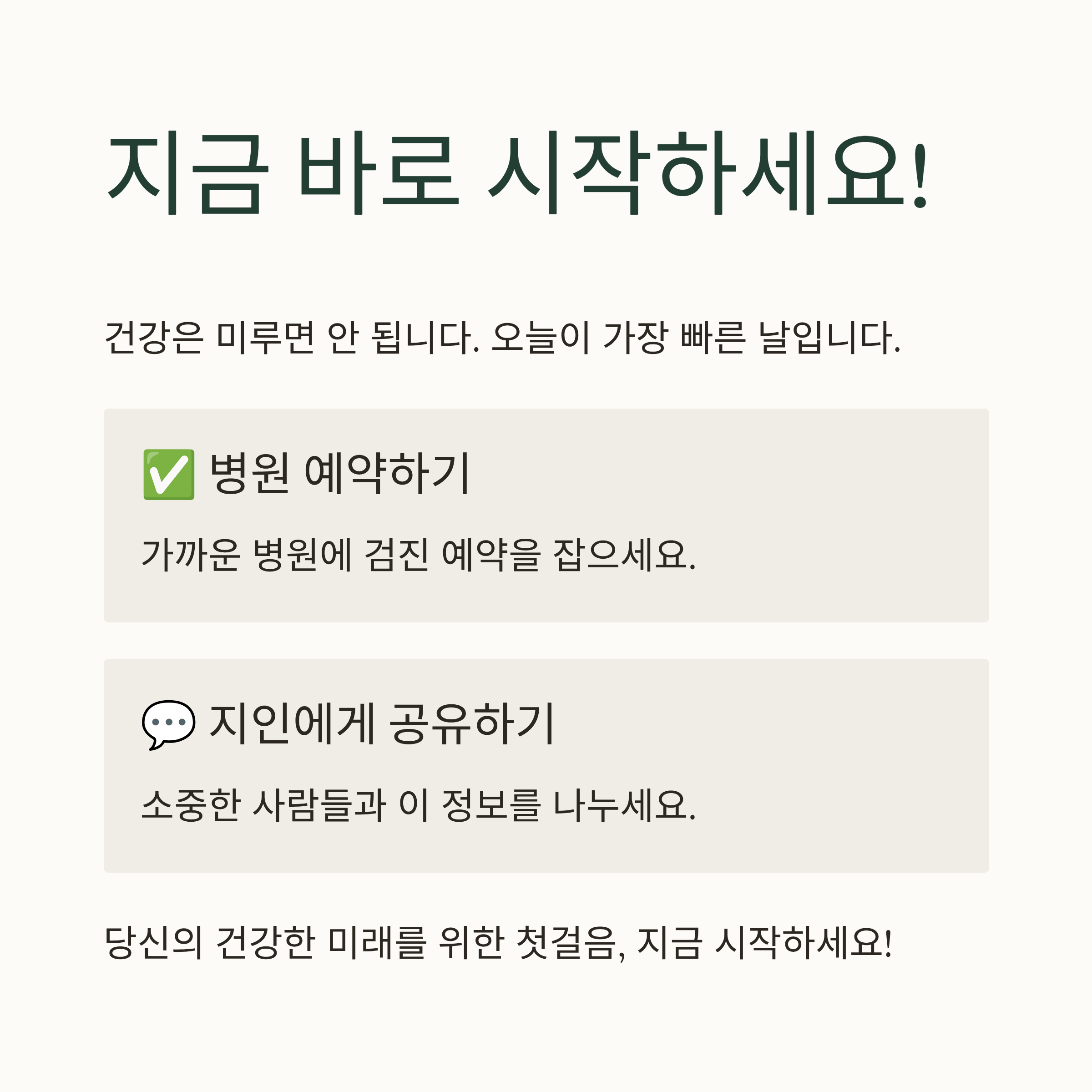 행동 유도(CTA): 오늘 이 가이드를 통해 자신에게 맞는 건강 검진 패키지를 선택하고, 망설이지 말고 지금 바로 검진 예약을 진행하세요! 건강한 삶은 작은 실천에서 시작됩니다.