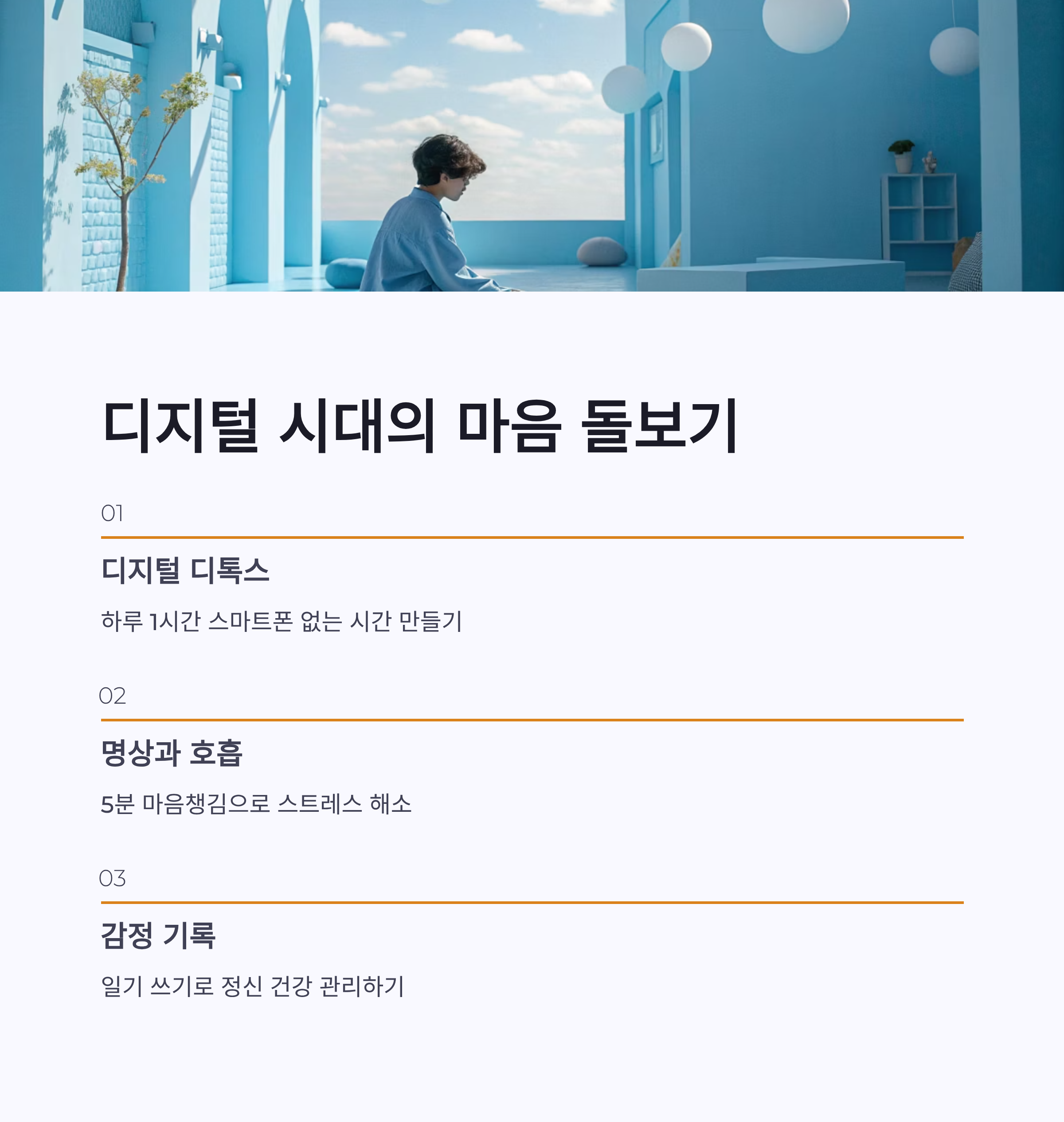 - 오늘의 팁: 하루 1시간이라도 스마트폰을 내려놓고 독서, 산책, 명상, 취미 활동 등 아날로그 활동에 집중해보세요. 잠자리에 들기 전에는 스마트폰을 침실 밖이나 손이 닿지 않는 곳에 두는 것이 숙면과 정신 건강에 도움이 됩니다.