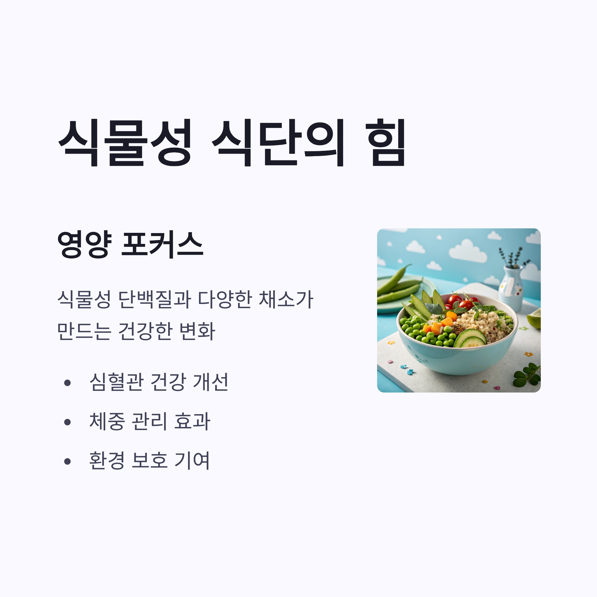 - 오늘의 팁: 일주일에 2~3회는 콩, 두부, 렌틸콩, 견과류, 버섯 등 식물성 단백질 위주의 식사를 시도하고, 다양한 색깔의 채소와 과일을 충분히 섭취하세요. 가공식품보다는 자연 그대로의 식재료를 활용하는 것이 중요합니다.