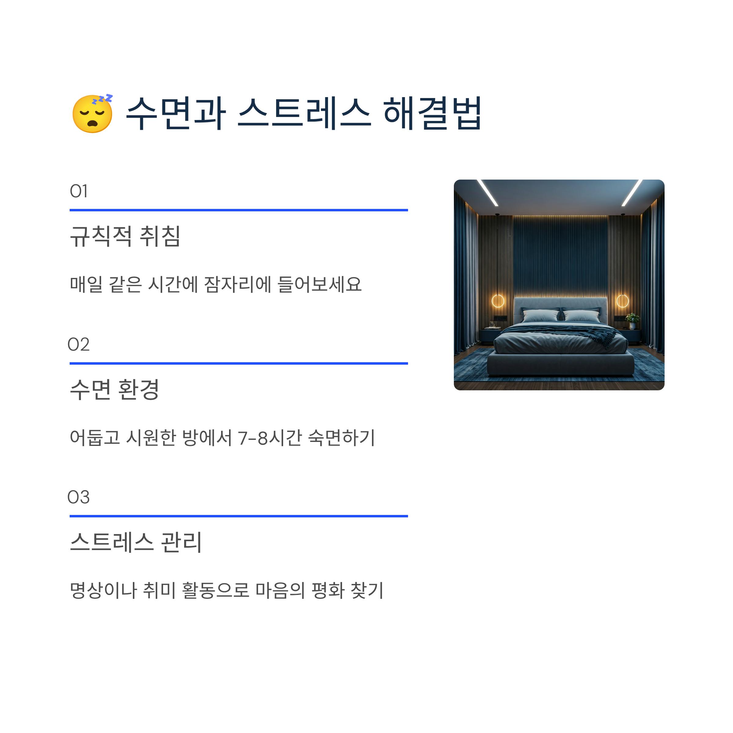 | 수면 | 규칙적인 수면 습관, 편안한 수면 환경 조성, 잠들기 전 스마트폰 자제 |