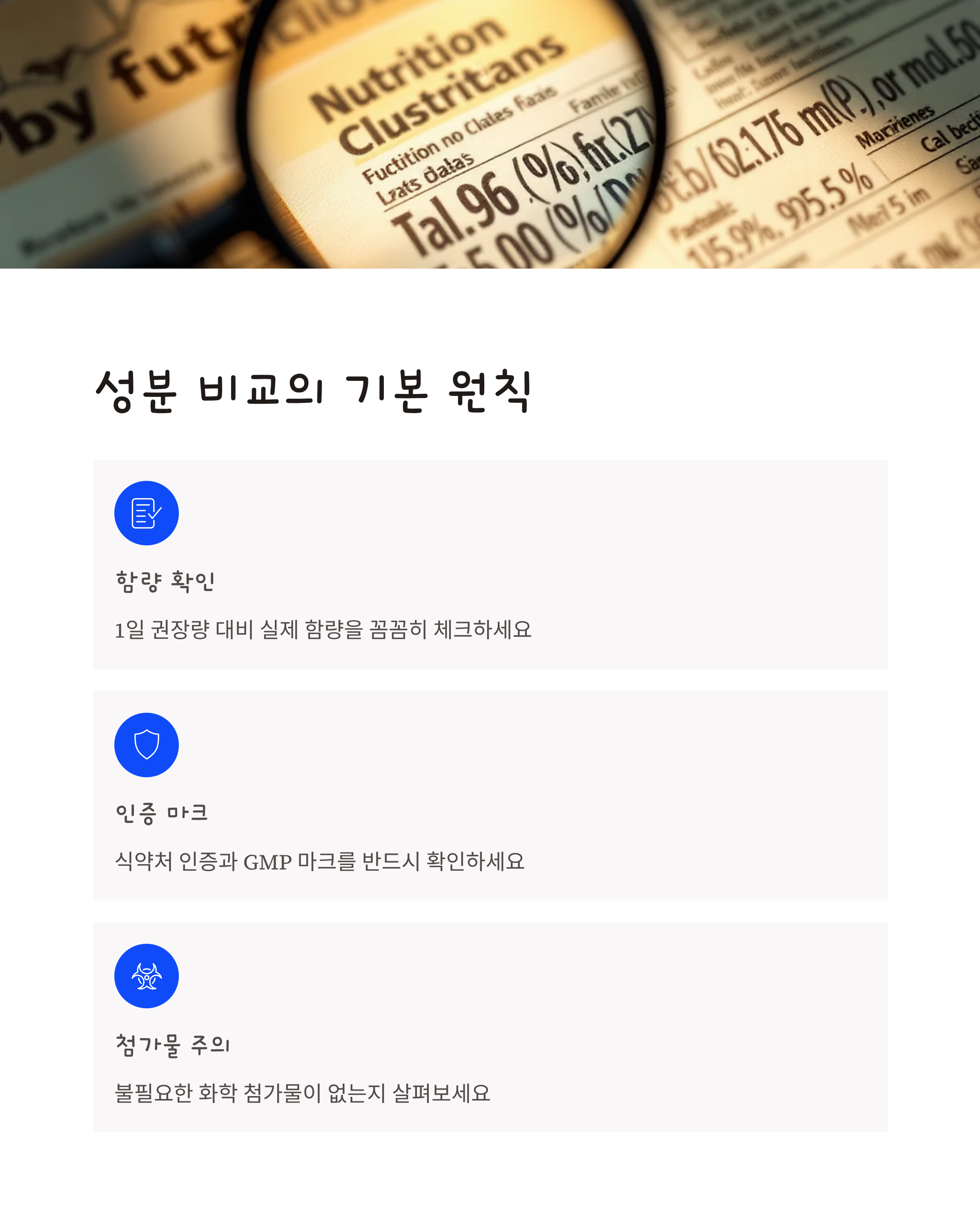 | 성분표 확인 | 함량 및 원료 출처, 부원료 꼼꼼히 확인 |