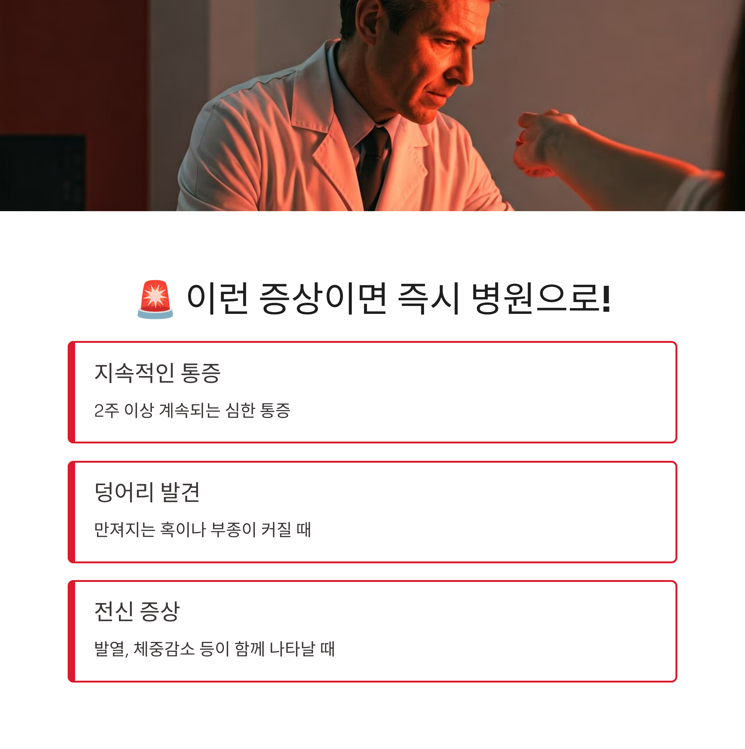 - 즉시 병원 방문: 멍울, 지속적인 통증, 전신 증상(발열, 체중 감소) 동반 시.