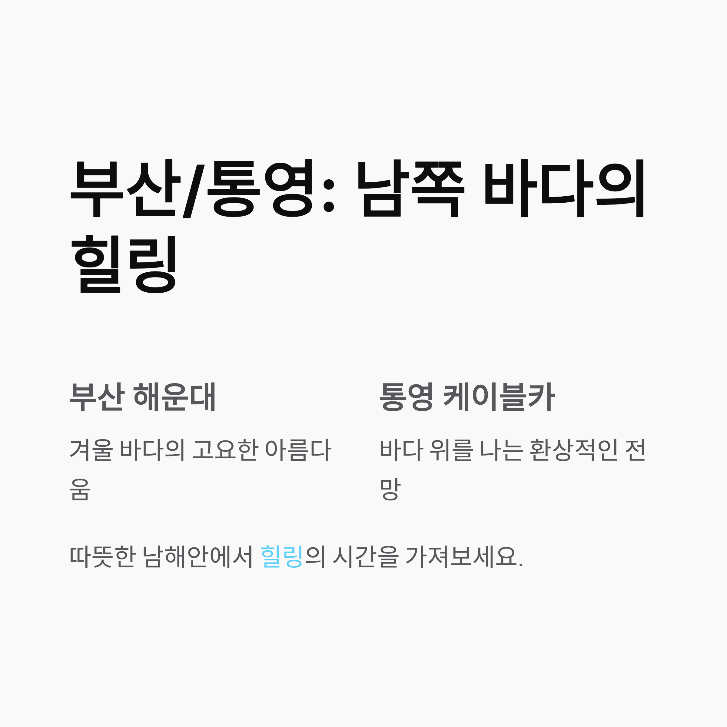 부산과 통영은 한국 본토에서 가장 따뜻한 지역으로 꼽혀요. 특히 겨울에는 북적이는 인파 없이 깨끗하고 시원한 바다를 만날 수 있습니다. 뜨끈한 국물이 있는 국밥이나 제철 해산물을 즐기기에도 최적의 장소입니다.