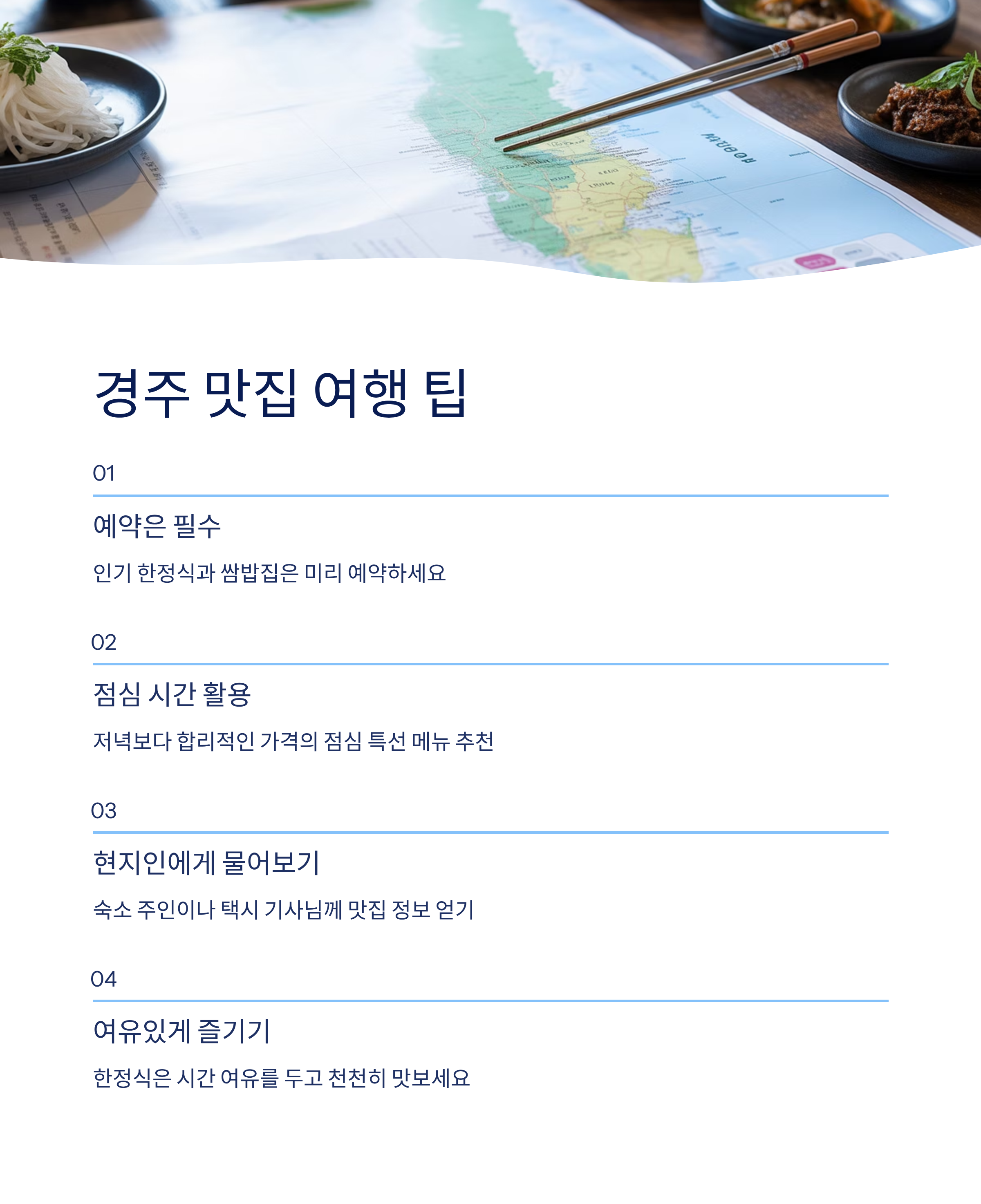 이런 꼼꼼한 준비가 여러분의 경주 여행을 더욱 여유롭고 만족스럽게 만들어줄 거예요. 맛있는 여행 되세요! 😋