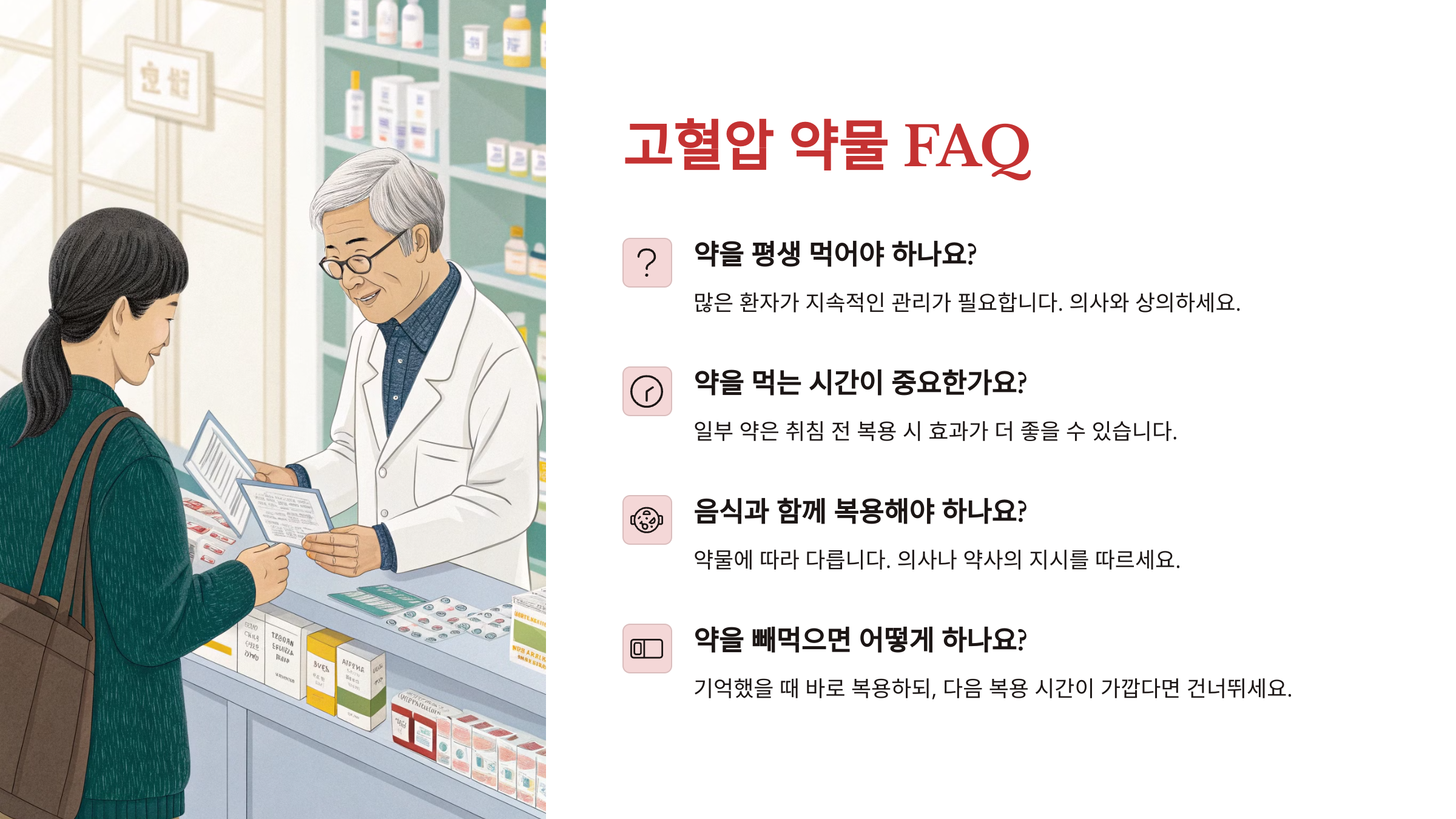 이제 생활 습관까지 꼼꼼히 알아봤으니, 마지막으로 사람들이 가장 궁금해하는 고혈압 약 관련 질문들을 FAQ로 정리해서 알려드릴게요! 👇
