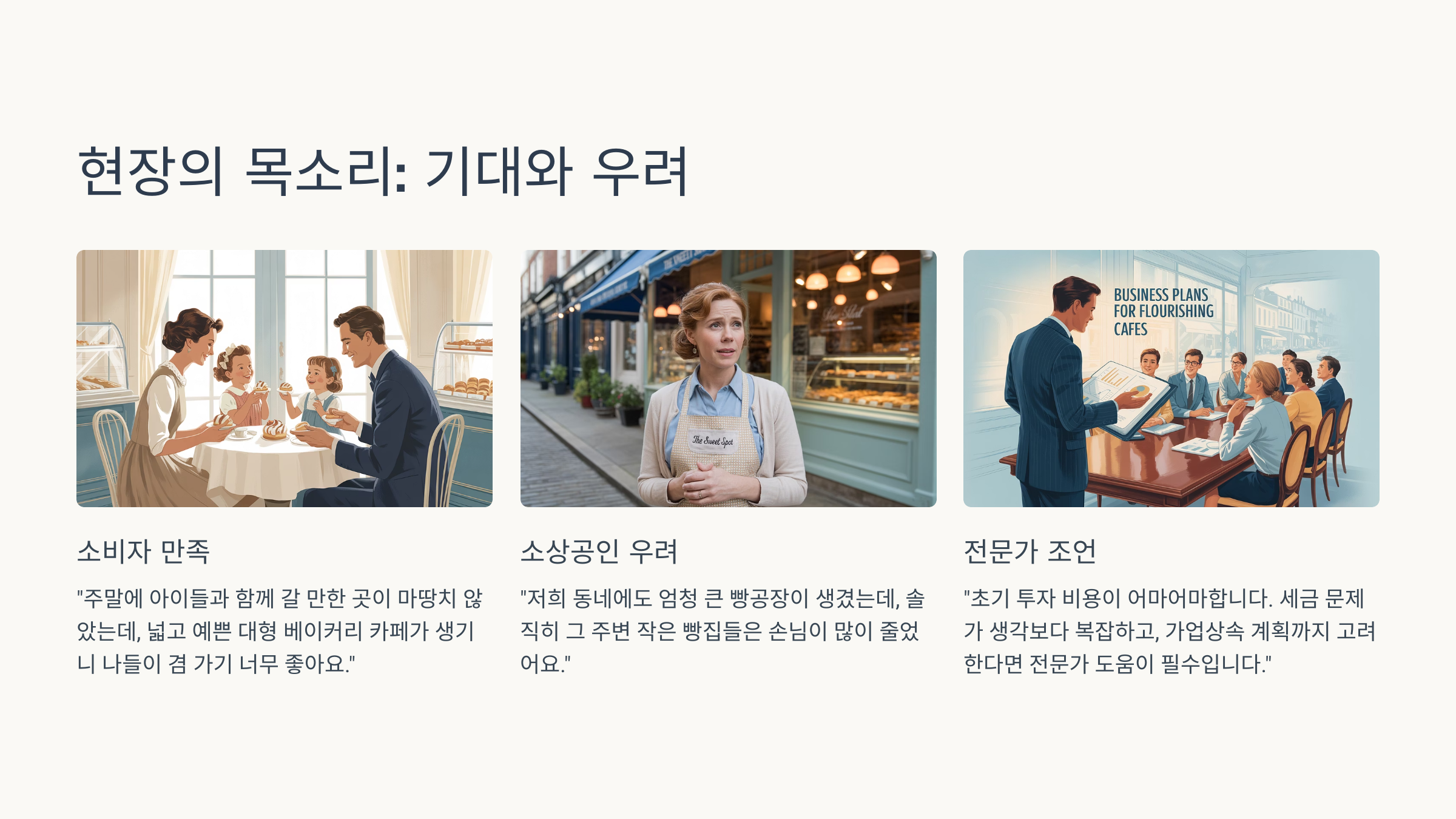 “저희 동네에도 엄청 큰 빵공장이 생겼는데, 솔직히 그 주변 작은 빵집들은 손님이 많이 줄었어요. 대형 매장만의 장점도 있겠지만, 개성 있는 동네 가게들이 사라지는 건 아쉬운 일이죠.” – 박상현 (자영업자, 50대)