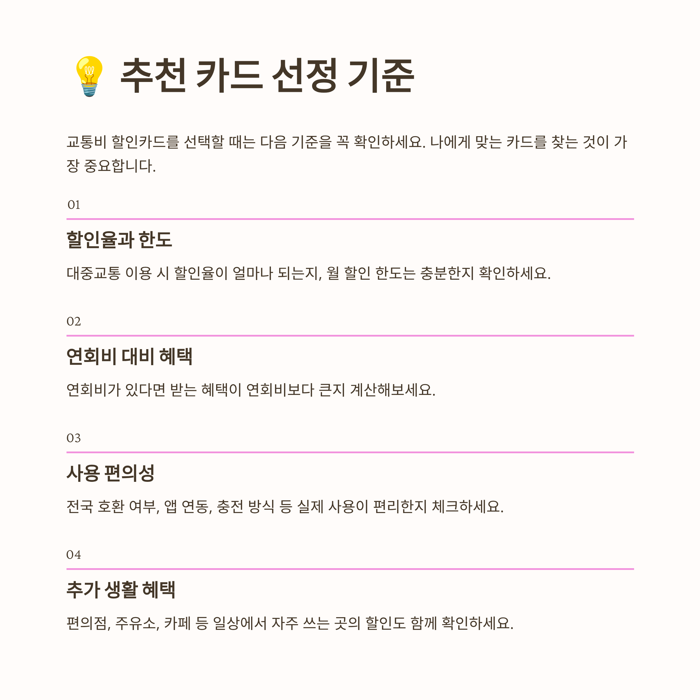 - 부가 혜택의 유용성: 교통비 외에 생활 속에서 자주 이용하는 분야(통신비, 카페, 편의점 등)에서 추가 혜택이 있는지 여부.