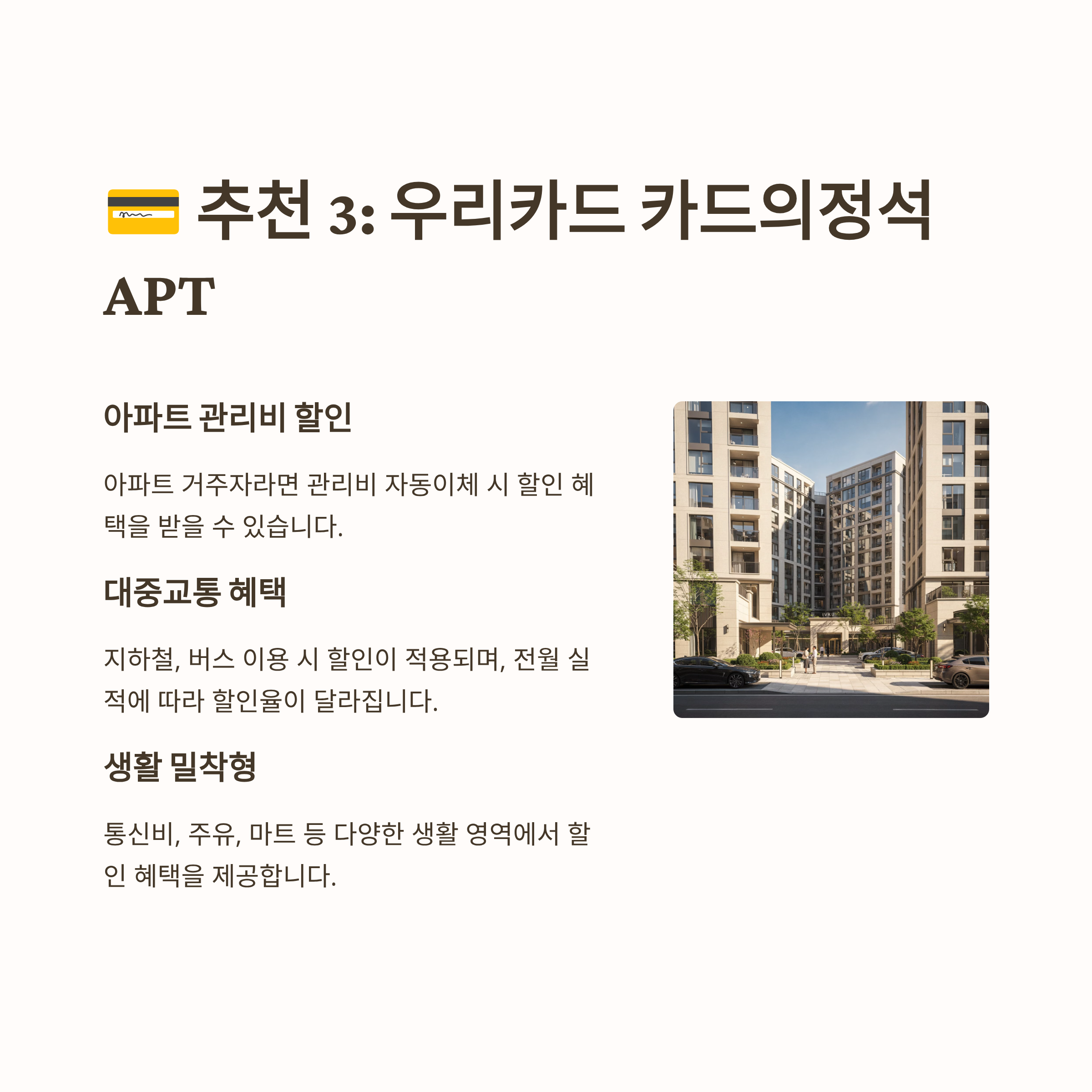 우리카드의 카드의정석 APT(이하 'APT 카드'로 통칭)는 대중교통 할인과 함께 아파트 관리비, 통신비 등 고정 지출 할인에 강점을 가진 카드입니다. (※ APT 카드는 가상 예시입니다. 실제 우리카드에서 유사한 혜택의 카드가 출시될 수 있습니다.)