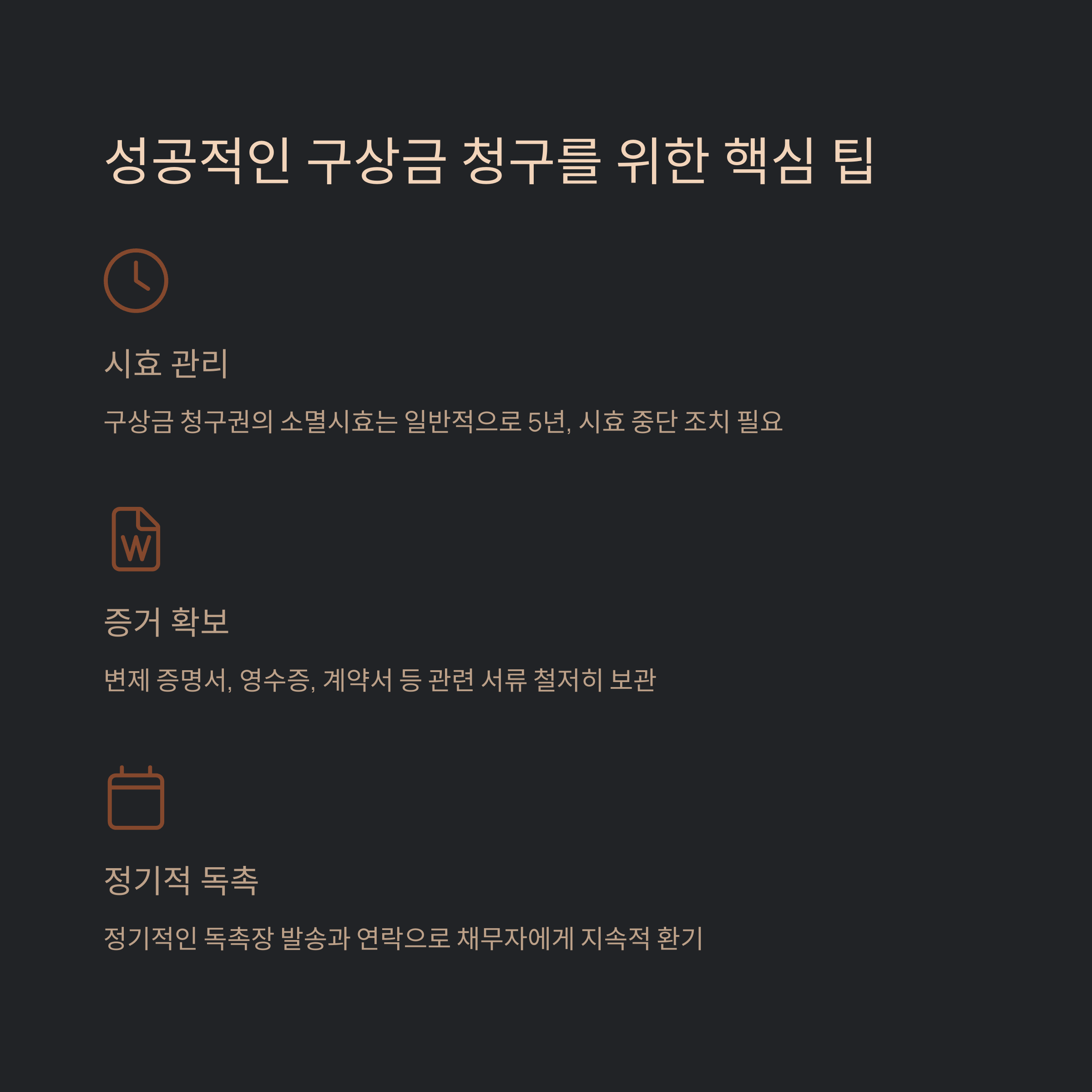 구상금 청구 및 채권 추심은 쉽지 않은 과정이에요. 하지만 몇 가지 중요한 팁을 기억하고 실천하면 성공 가능성을 크게 높일 수 있습니다.