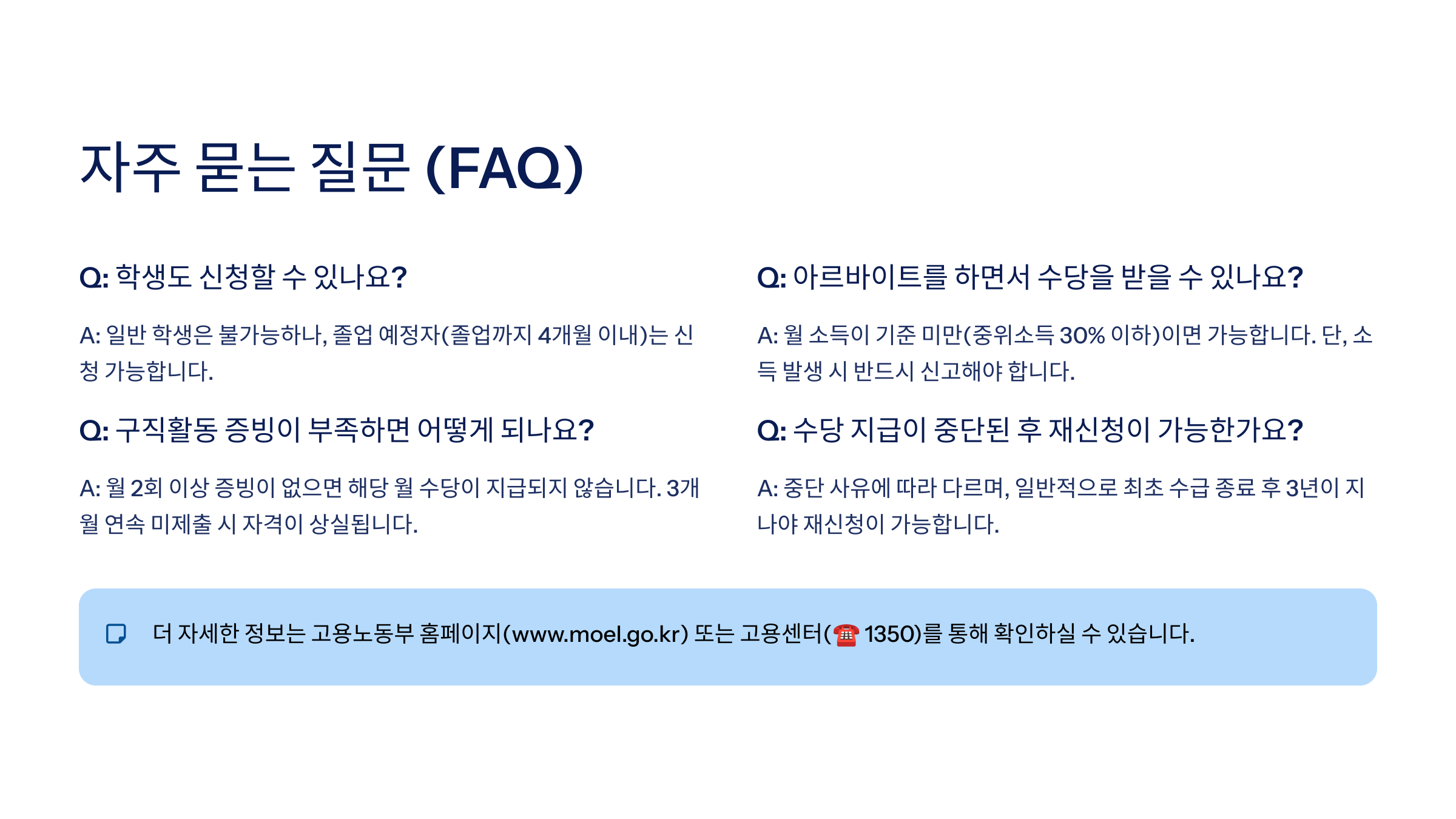 5. 부정수급 절대 금지: 허위 자료 제출, 소득 미신고 등 부정적인 방법으로 수당을 수급하는 경우, 지급된 수당 전액 환수 및 추가 징수, 형사 고발 등 불이익을 받을 수 있습니다. 정직하게 신청하고 성실하게 참여하세요.