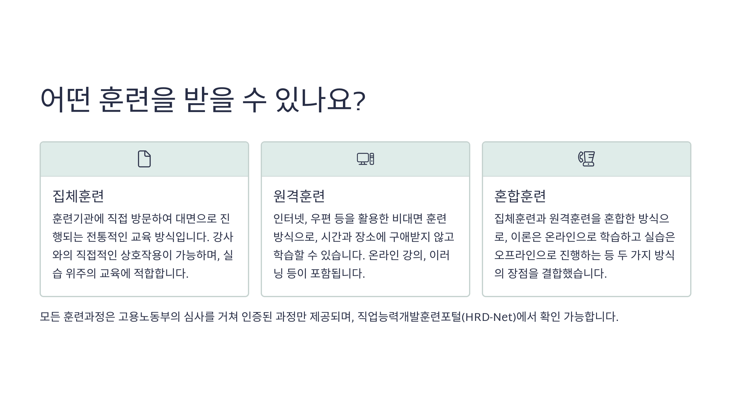 이처럼 국민내일배움카드는 개인의 커리어 목표와 학습 필요에 따라 다채로운 선택지를 제공합니다. 중요한 것은 훈련 과정이 HRD-Net에 등록되어 국비 지원 대상인지 확인하는 것입니다.